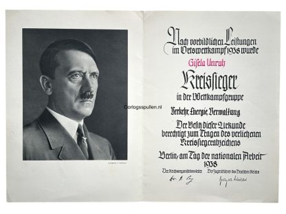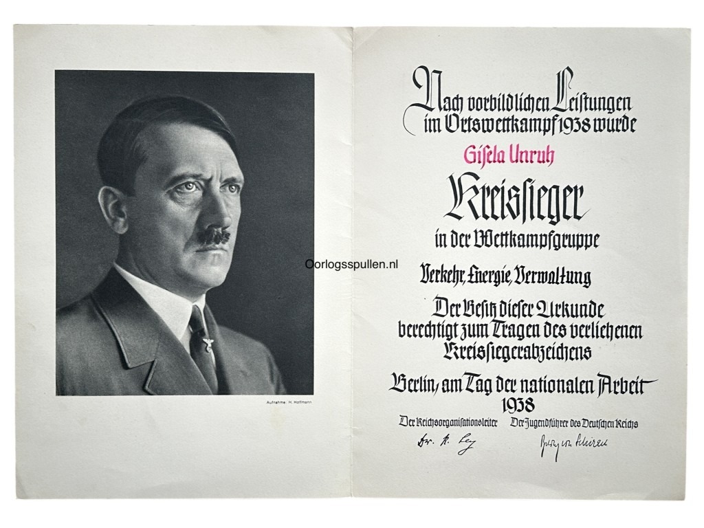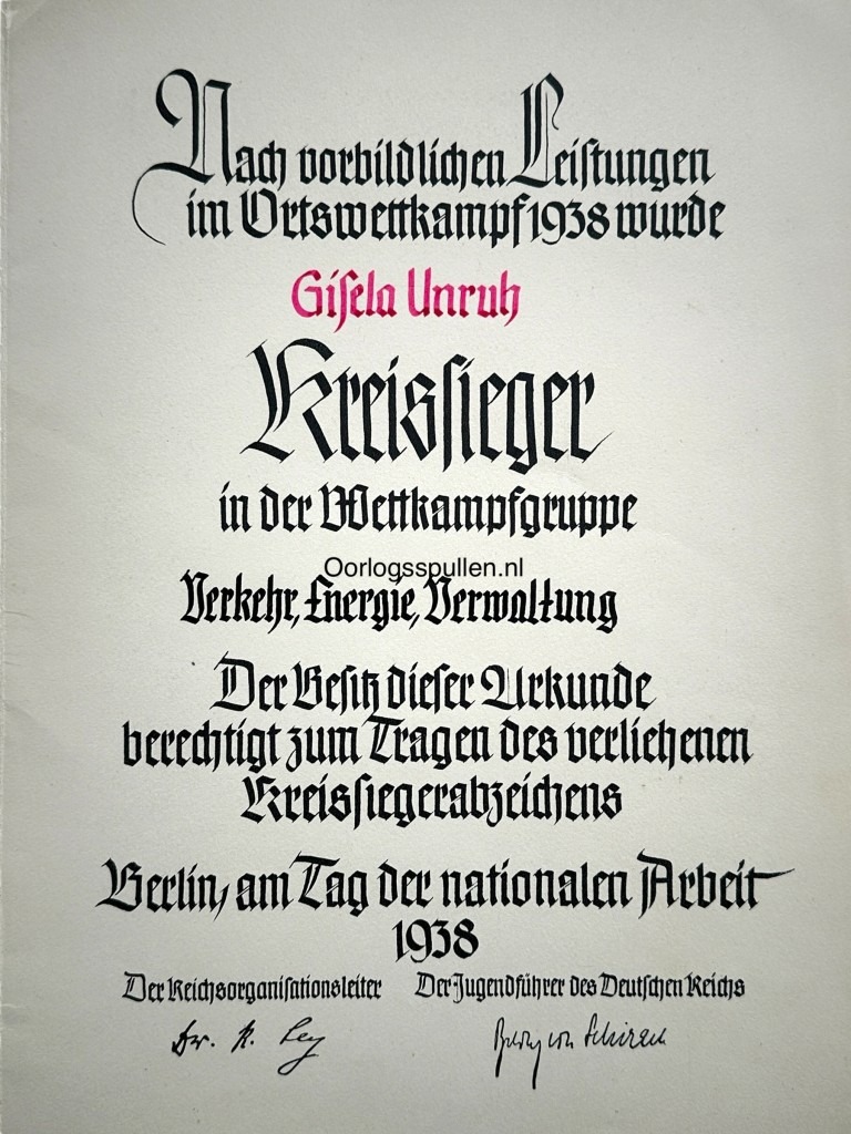 This Hitlerjugend Kreissieger certificate is in good condition and belonged to Gissela Unruh and dates from 1938.