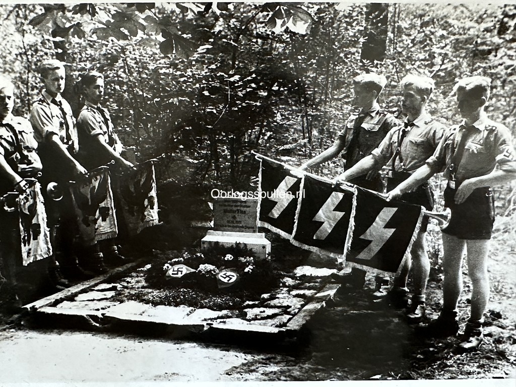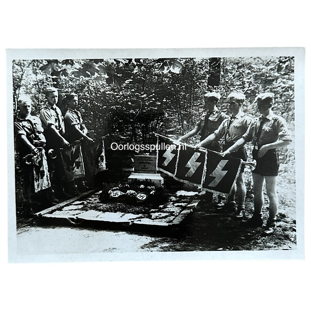 Deze Duitse foto is in goede conditie en daarop zijn de kinderen van de Hitlerjugend (Adolf-Hitler-Schule) bij het graf van Walter Flex in 1943 te zien.