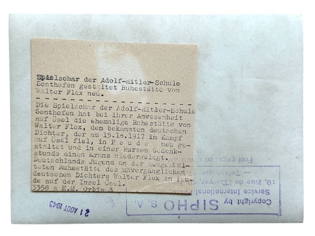 De toneelgroep van de Adolf-Hitler-school in Sonthofen heeft tijdens haar verblijf op Ösel de voormalige rustplaats van Walter Flex, de bekende Duitse dichter die op 15-10-1917 in de strijd op Ösel sneuvelde, in Pseudo opnieuw ingericht. Tijdens een korte herdenkingsplechtigheid werd een krans gelegd. De jeugd van Duitsland bij de opnieuw ingerichte rustplaats van de onvergankelijke Duitse dichter Walter Flex in Pseudo op het eiland Ösel.