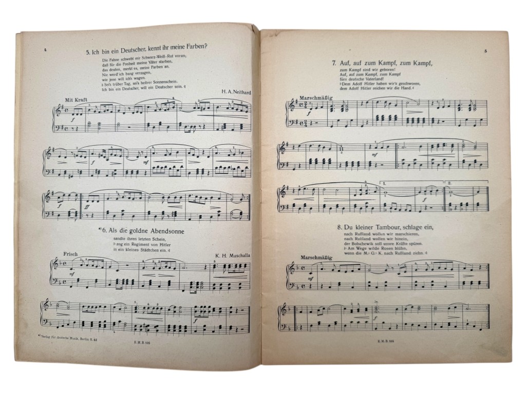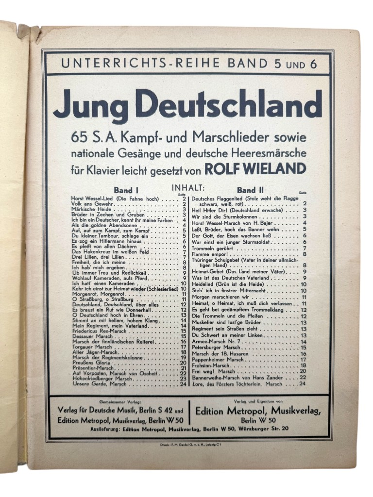 The book, titled Jung Deutschland, contains a total of 65 marching and propaganda songs, compiled in multiple sections and specially arranged for piano by Rolf Wieland.