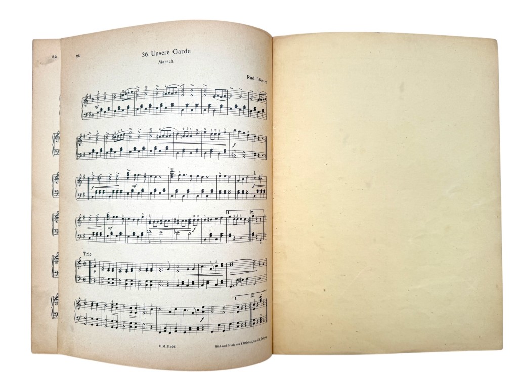 Deze Duitse Hitlerjugend-liedbundel uit de Tweede Wereldoorlog is in gebruikte conditie. Het boek, getiteld Jung Deutschland, bevat in totaal 65 mars- en propagandaliederen, samengebracht in meerdere delen en speciaal gezet voor piano door Rolf Wieland. De bundel is voorzien van een opvallende omslag met tijdtypische vormgeving en opent met een overzicht van alle opgenomen liederen, gevolgd door volledig uitgeschreven muziekpartituren. De interne pagina’s tonen nog steeds scherpe druk, duidelijke notatie en de oorspronkelijke lay-out zoals die tijdens de oorlogsjaren door de Duitse muziekuitgeverijen werd verspreid.