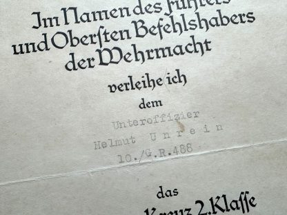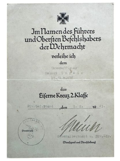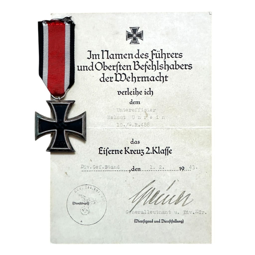 Dit IJzeren Kruis 2de klasse met oorkonde zijn in goede conditie en werd uitgereikt op 1 februari 1943 aan de onderofficier Helmut Unrein welke diende in het Grenadier-Regiment 488.