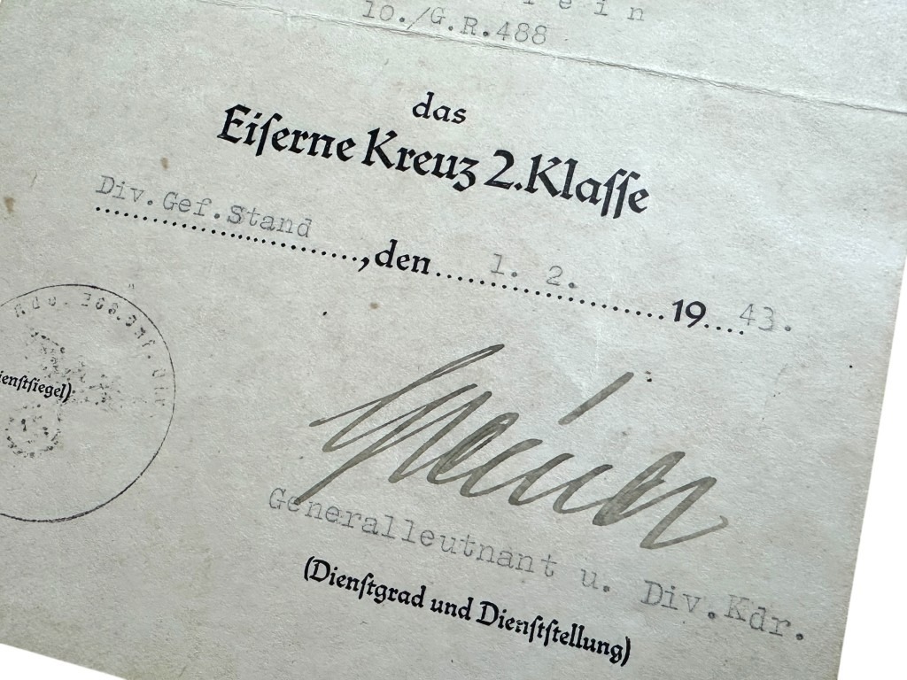 Origineel WWII Duits IJzeren Kruis 2de klasse met oorkonde Grenadier-Regiment 488