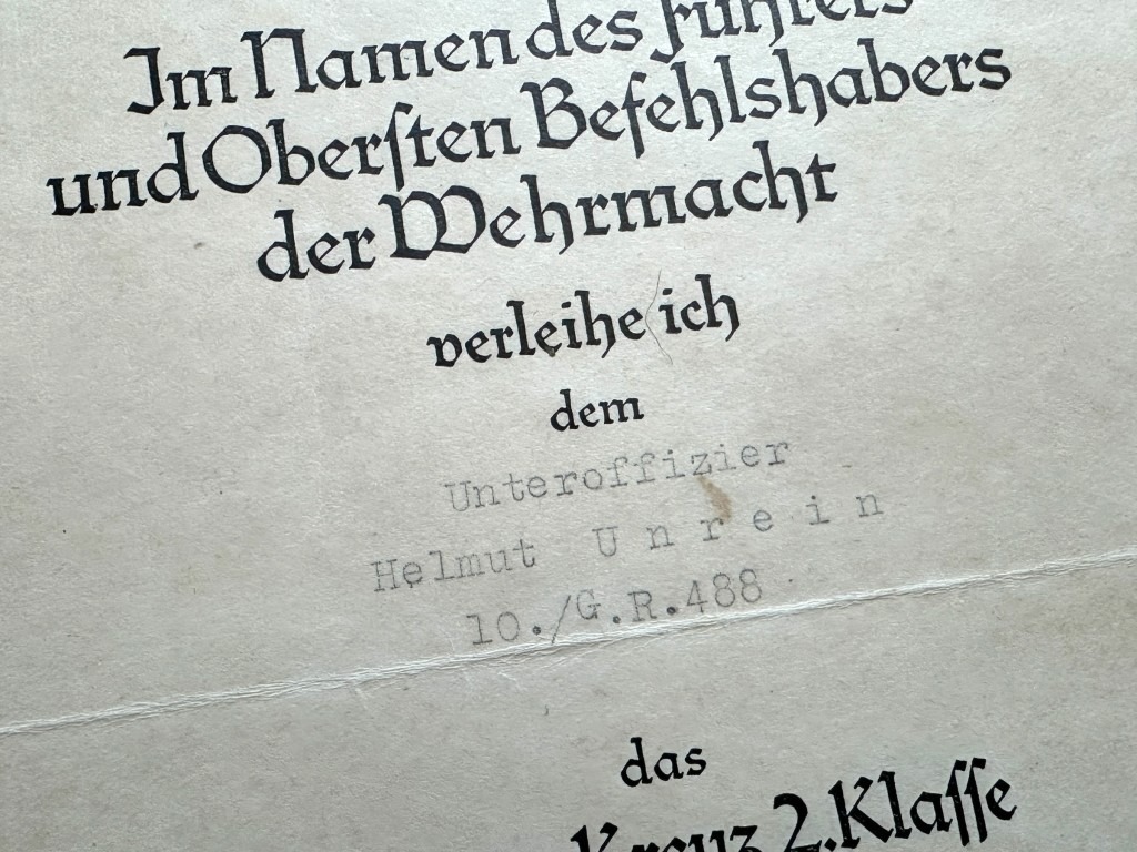 This Iron Cross 2nd Class with certificate are in good condition and was awarded on February 1, 1943 to NCO Helmut Unrein who served in the Grenadier-Regiment 488.
