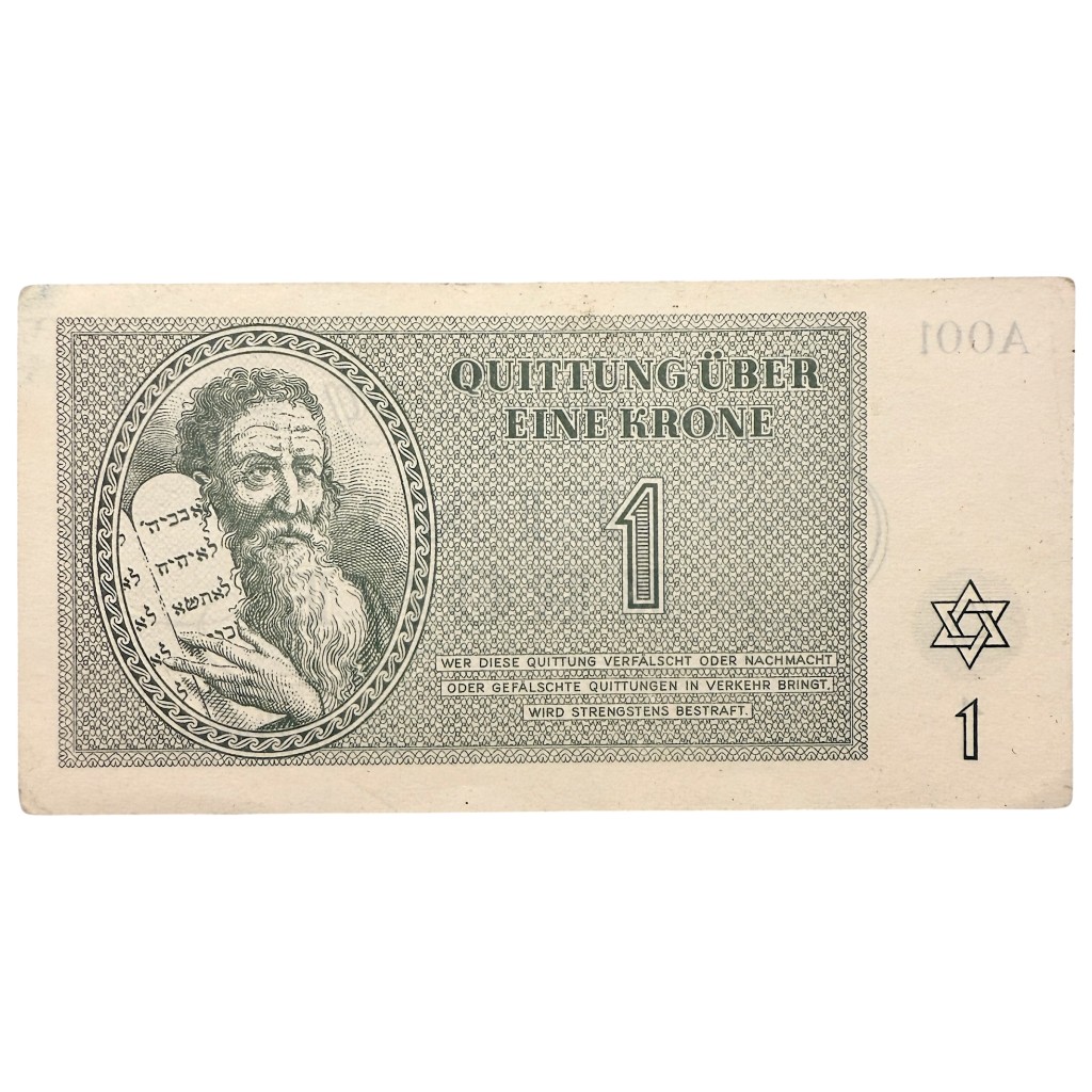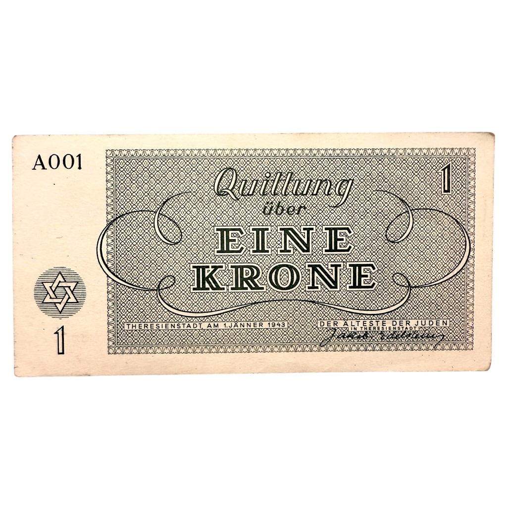 This 1 Krone banknote was issued in the Theresienstadt (Terezín) ghetto and concentration camp during the Second World War.