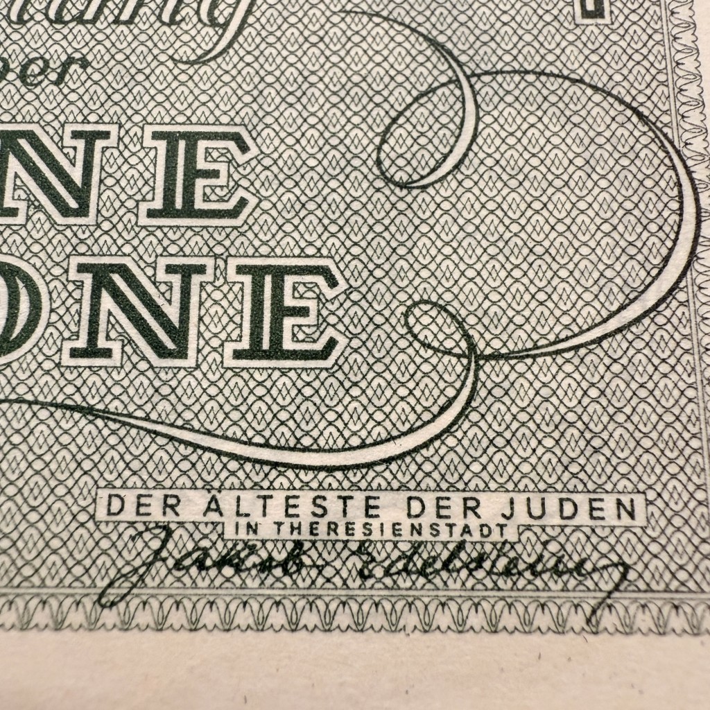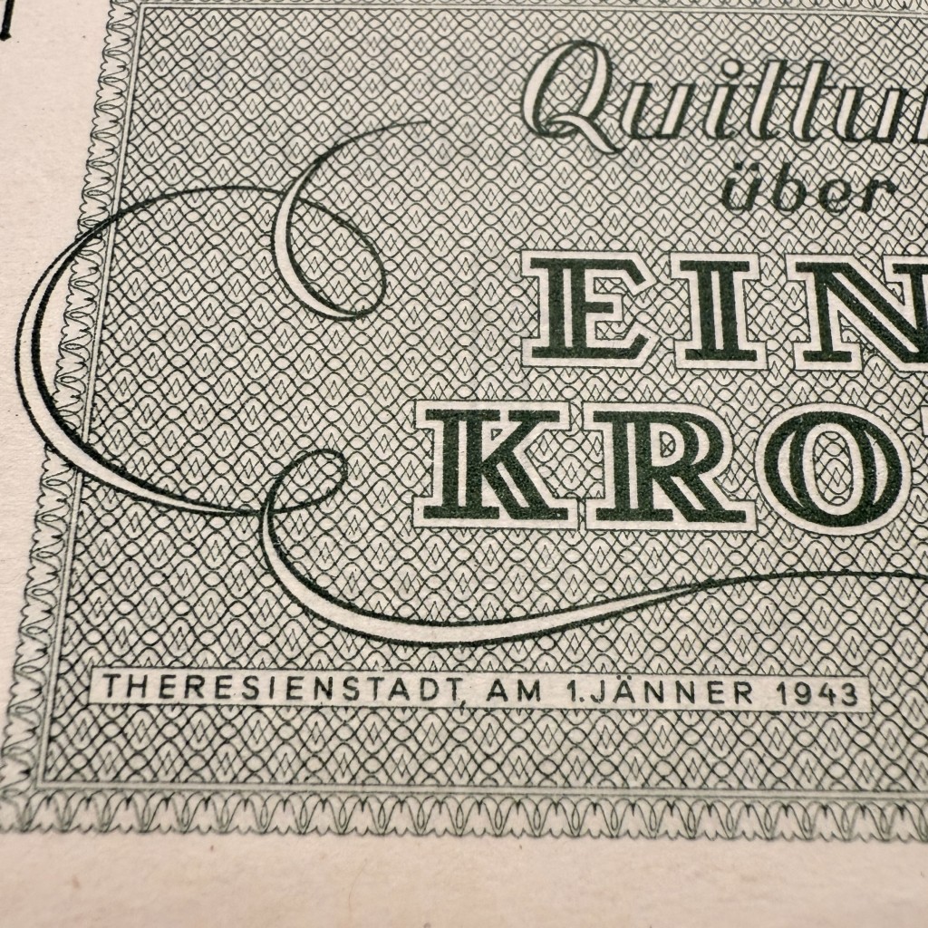 De keerzijde toont sierlijke belettering met de tekst “Quittung über Eine Krone” (Ontvangstbewijs voor Eén Krone), gedateerd 1 januari 1943 en ondertekend door de “Älteste der Juden in Theresienstadt” (Oudste der Joden in Theresienstadt).