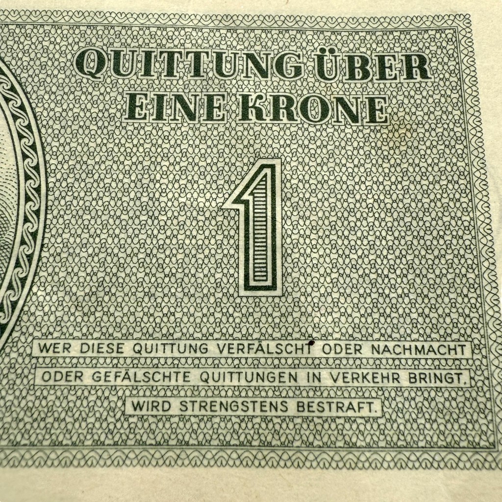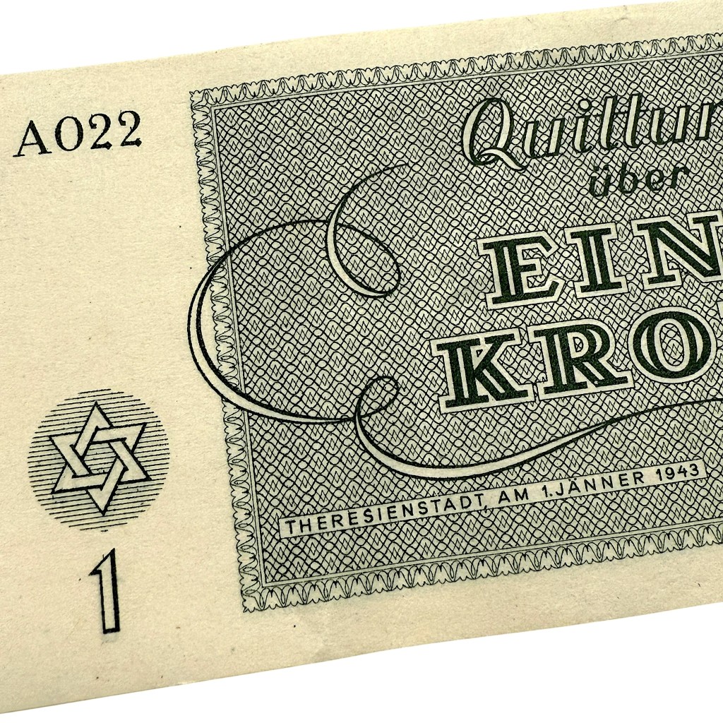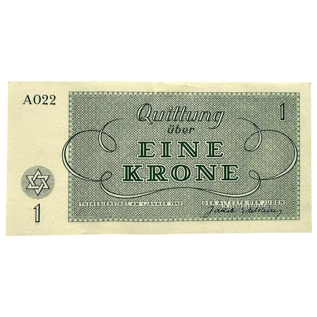This 1 Krone banknote was issued in the Theresienstadt (Terezín) ghetto and concentration camp during the Second World War.