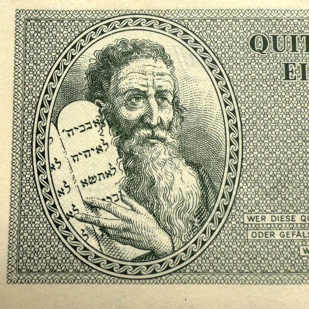 De voorzijde toont een gedetailleerd portret van Mozes met de stenen tafelen met Hebreeuwse inscripties, samen met de waardeaanduiding “1 Krone” en een Davidster.