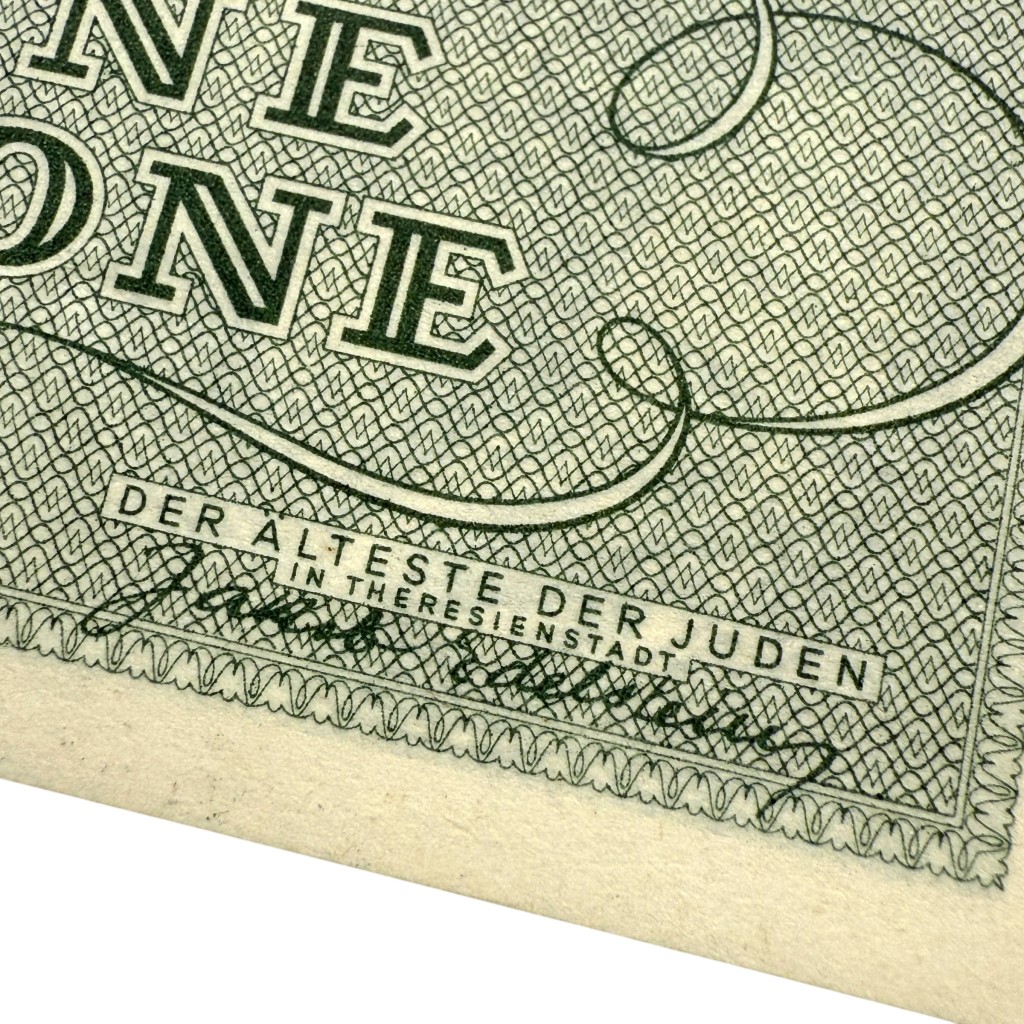 De keerzijde toont sierlijke belettering met de tekst “Quittung über Eine Krone” (Ontvangstbewijs voor Eén Krone), gedateerd 1 januari 1943 en ondertekend door de “Älteste der Juden in Theresienstadt” (Oudste der Joden in Theresienstadt).