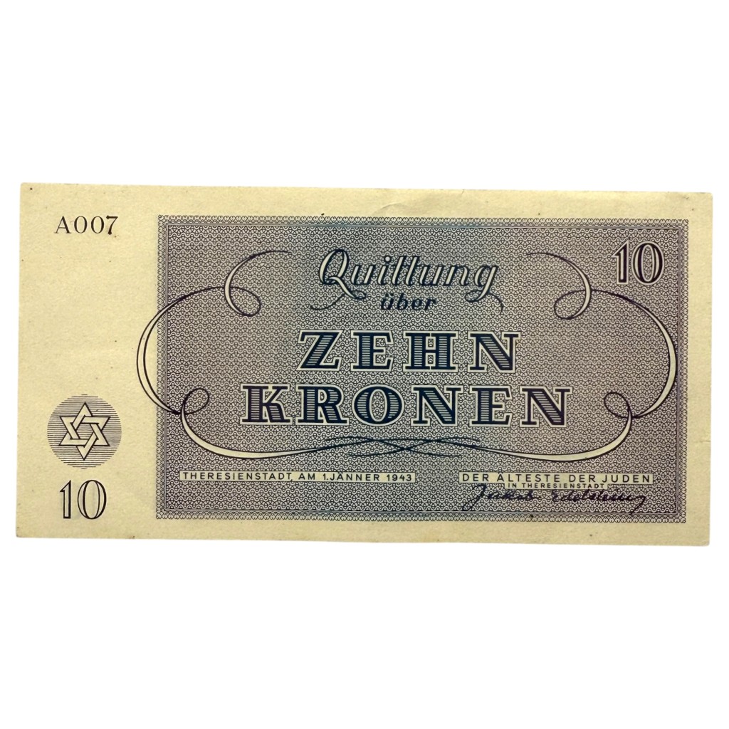 Dit biljet van 10 Kronen werd uitgegeven in het getto en concentratiekamp Theresienstadt (Terezín) tijdens de Tweede Wereldoorlog.