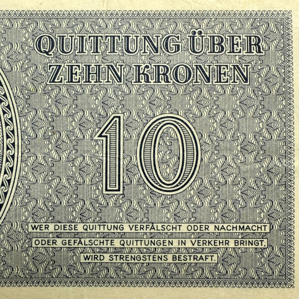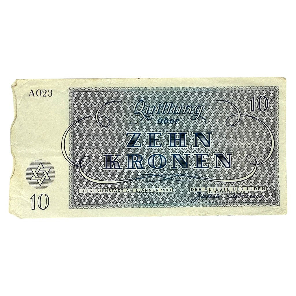 The reverse features ornate lettering with the text “Quittung über Zehn Kronen” (Receipt for ten Kronen), dated January 1st, 1943, and signed by the “Älteste der Juden in Theresienstadt” (Elder of the Jews in Theresienstadt).
