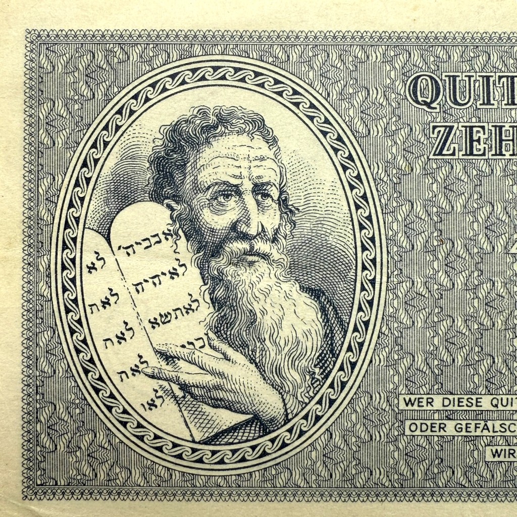 De voorzijde toont een gedetailleerd portret van Mozes met de stenen tafelen met Hebreeuwse inscripties, samen met de waardeaanduiding “10 Kronen” en een Davidster.