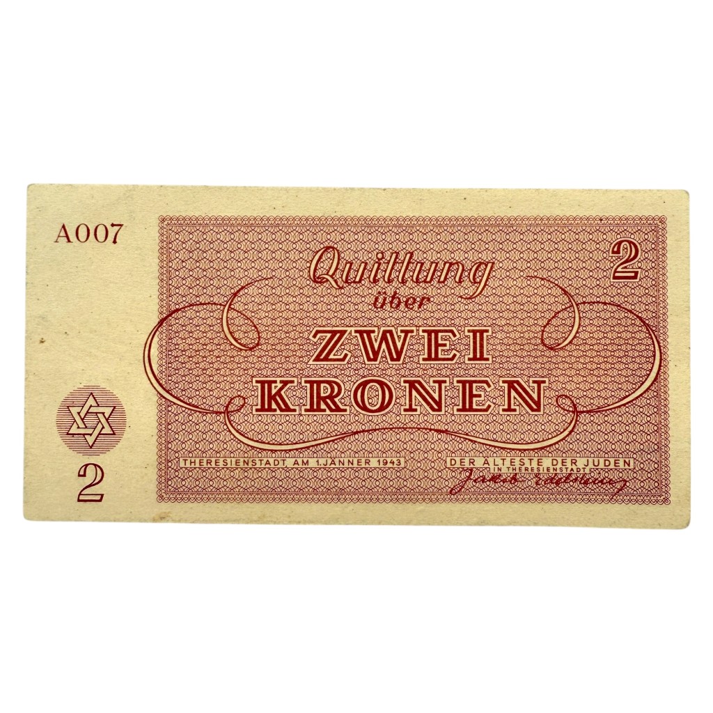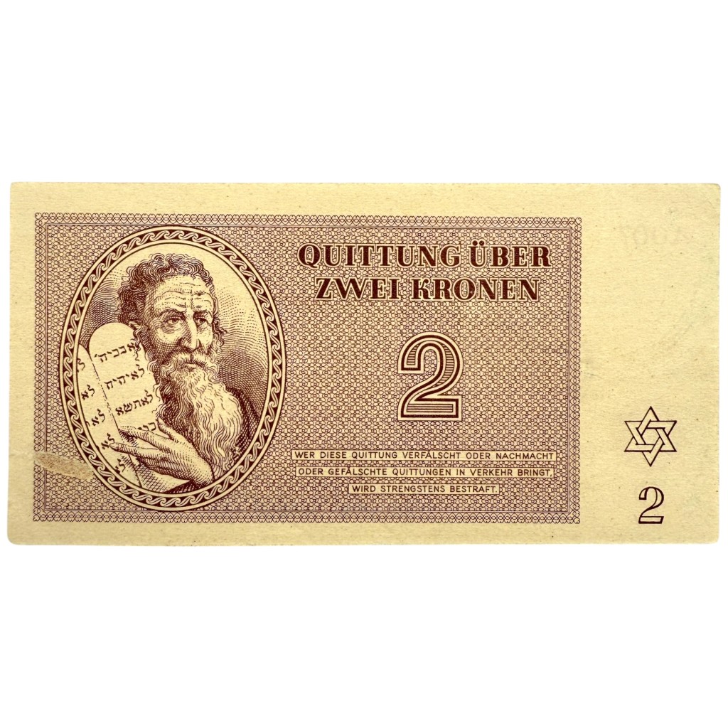 This 2 Kronen banknote was issued in the Theresienstadt (Terezín) ghetto and concentration camp during the Second World War.