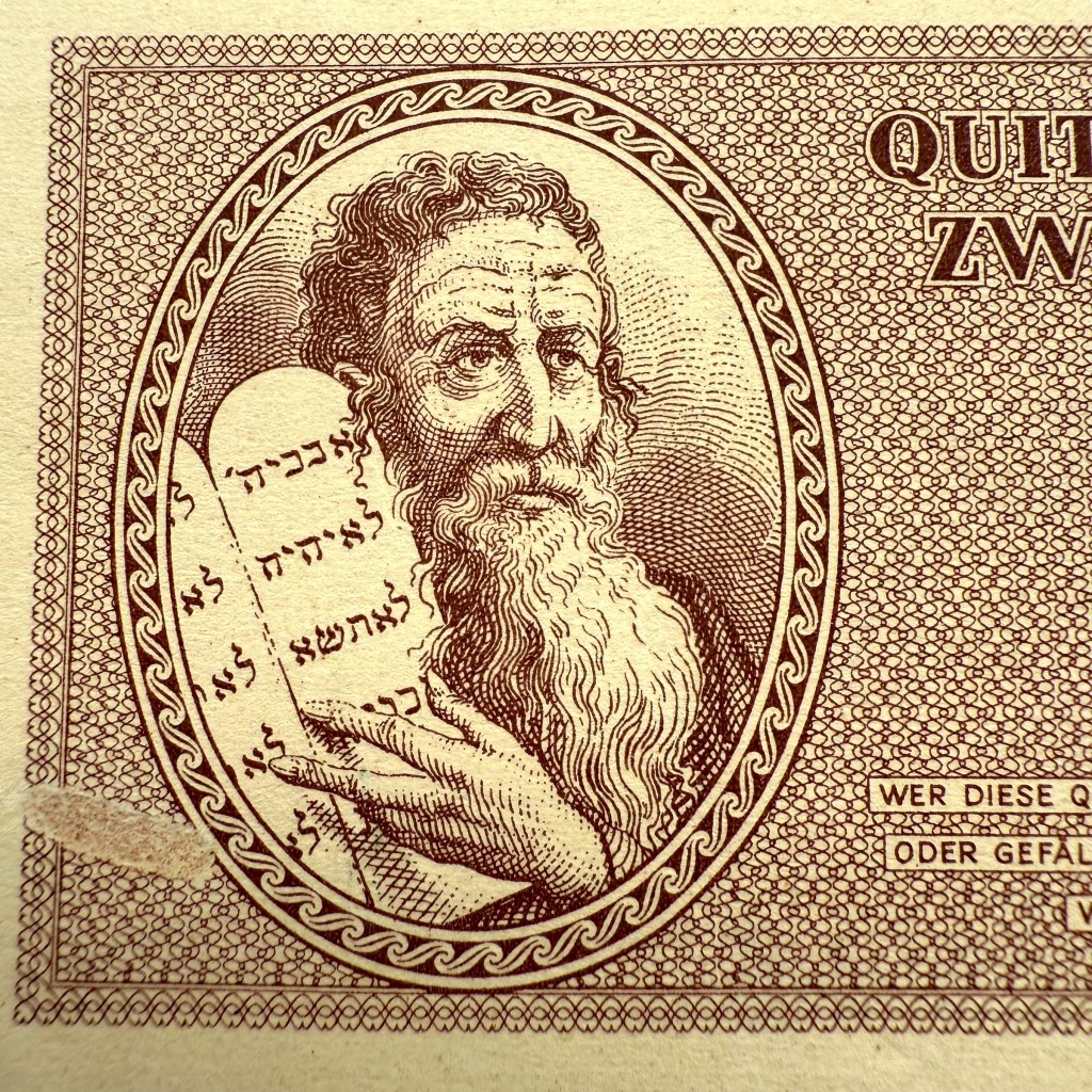 The obverse depicts a detailed portrait of Moses holding the stone tablets with Hebrew inscriptions, along with the denomination “2 Krone” and a Star of David.