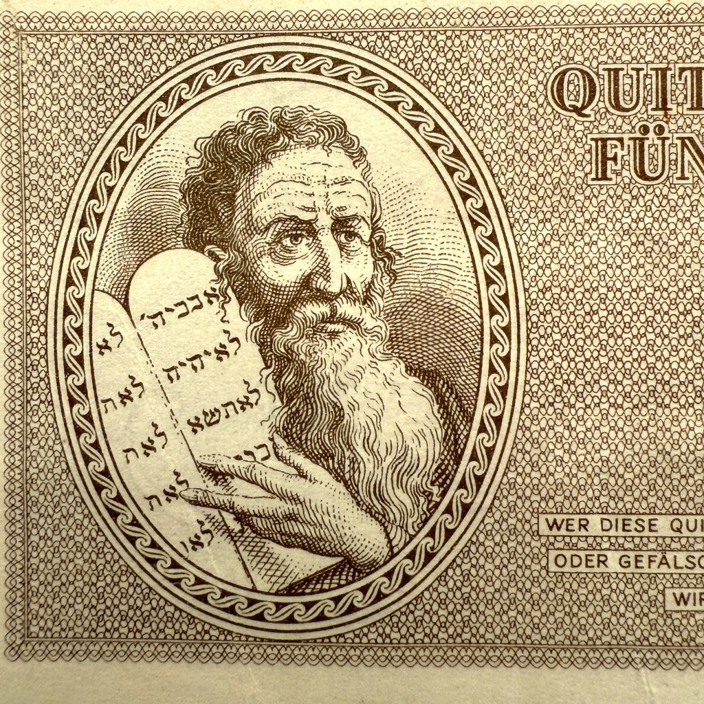 De voorzijde toont een gedetailleerd portret van Mozes met de stenen tafelen met Hebreeuwse inscripties, samen met de waardeaanduiding “5 Kronen” en een Davidster.