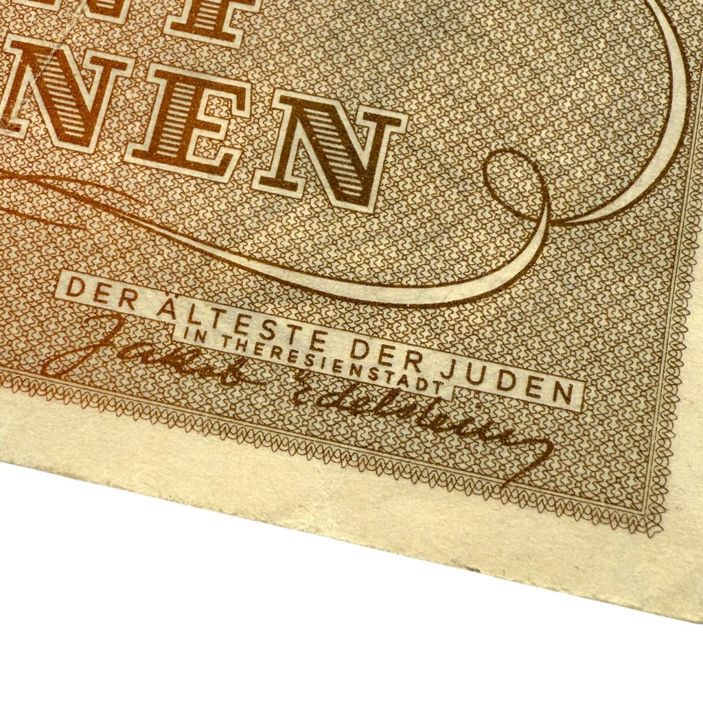 This 5 Kronen banknote was issued in the Theresienstadt (Terezín) ghetto and concentration camp during the Second World War.
