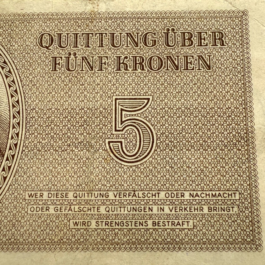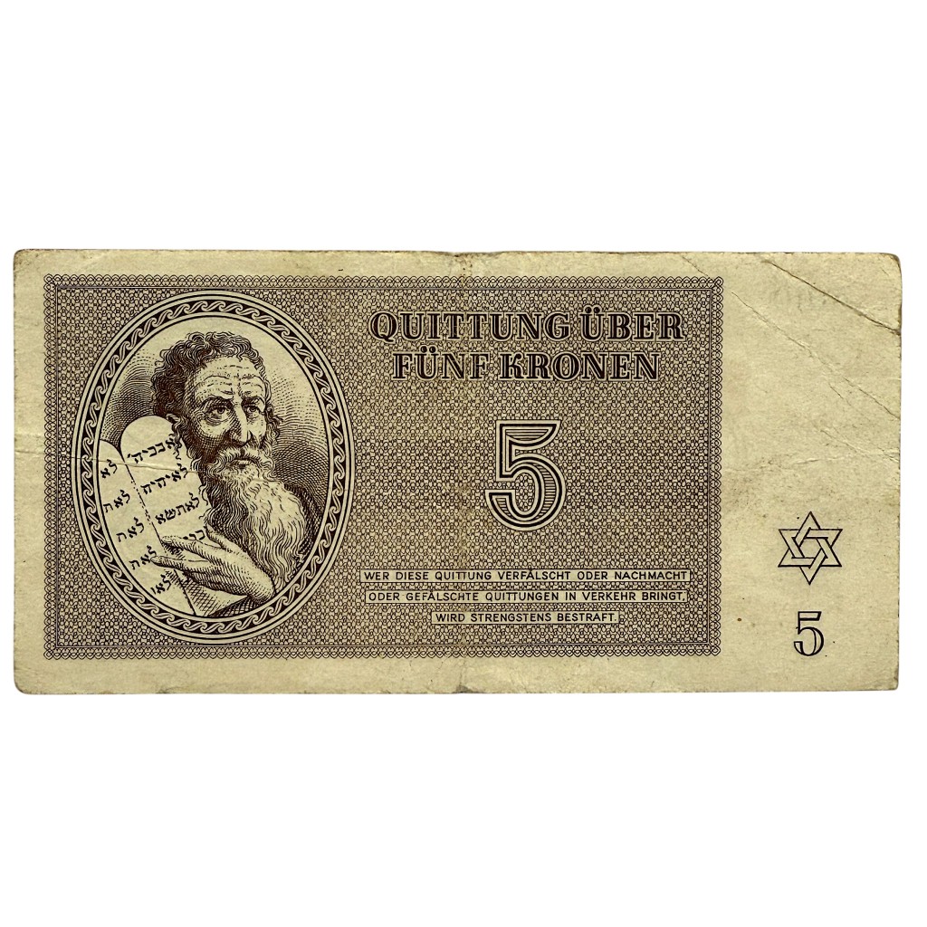 This 5 Kronen banknote was issued in the Theresienstadt (Terezín) ghetto and concentration camp during the Second World War.