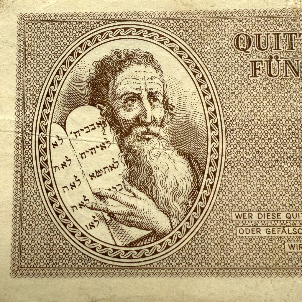 De voorzijde toont een gedetailleerd portret van Mozes met de stenen tafelen met Hebreeuwse inscripties, samen met de waardeaanduiding “5 Kronen” en een Davidster.