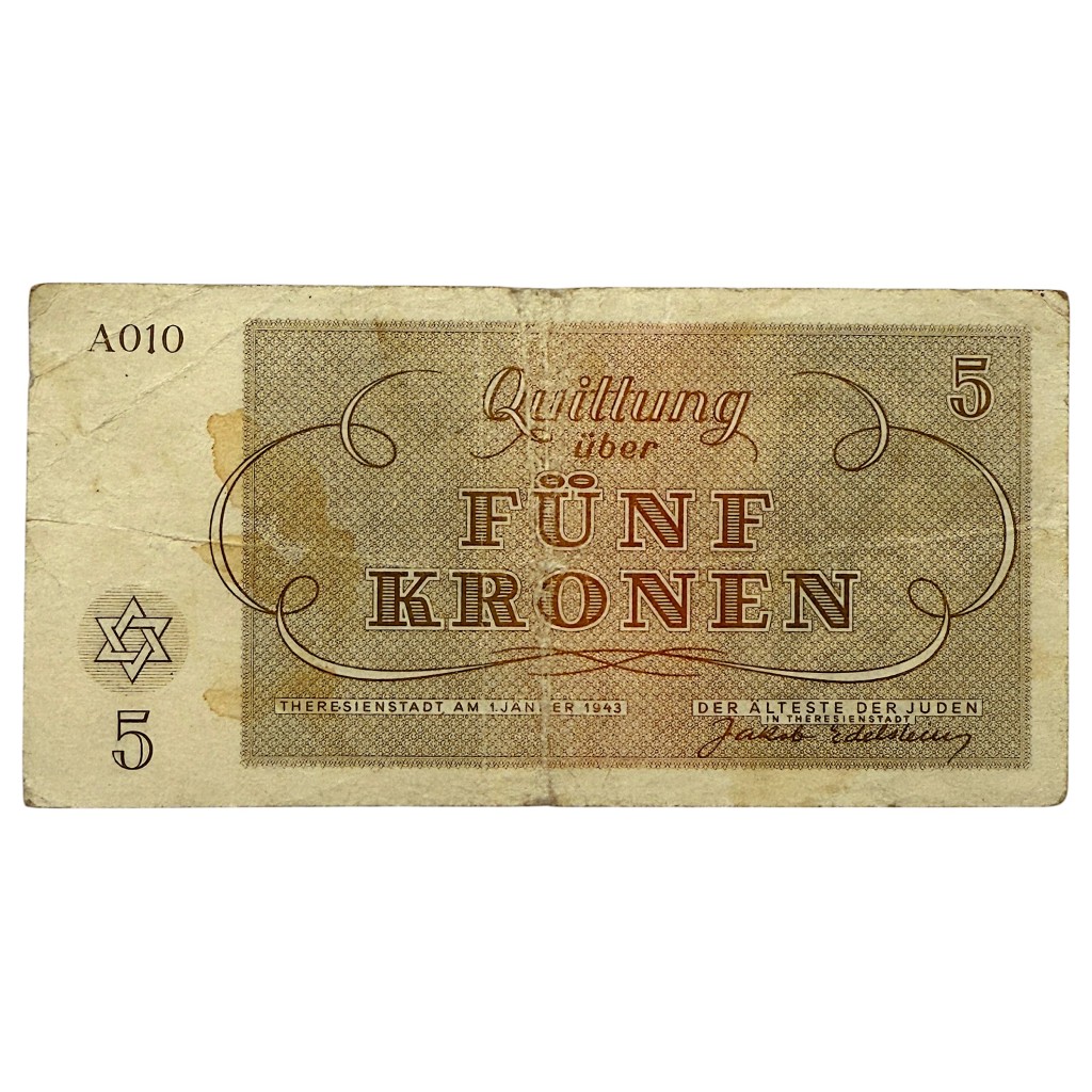 Dit biljet van 5 Kronen werd uitgegeven in het getto en concentratiekamp Theresienstadt (Terezín) tijdens de Tweede Wereldoorlog.