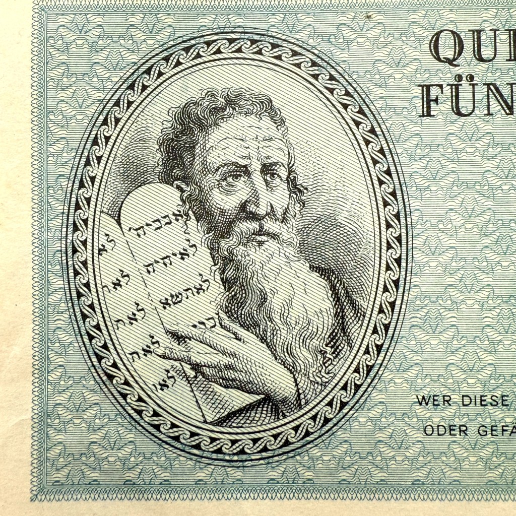 De voorzijde toont een gedetailleerd portret van Mozes met de stenen tafelen met Hebreeuwse inscripties, samen met de waardeaanduiding “50 Kronen” en een Davidster.
