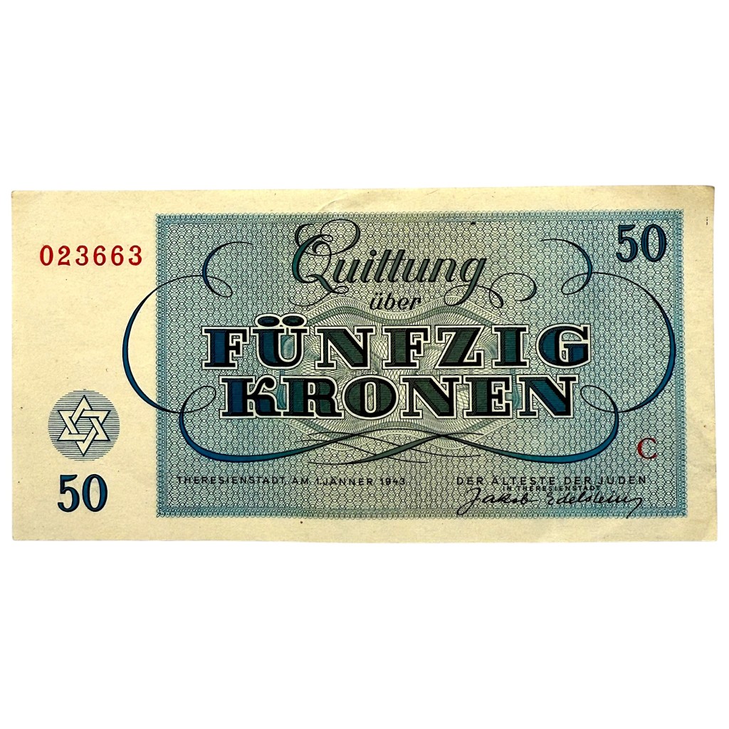 This 50 Kronen banknote was issued in the Theresienstadt (Terezín) ghetto and concentration camp during the Second World War.