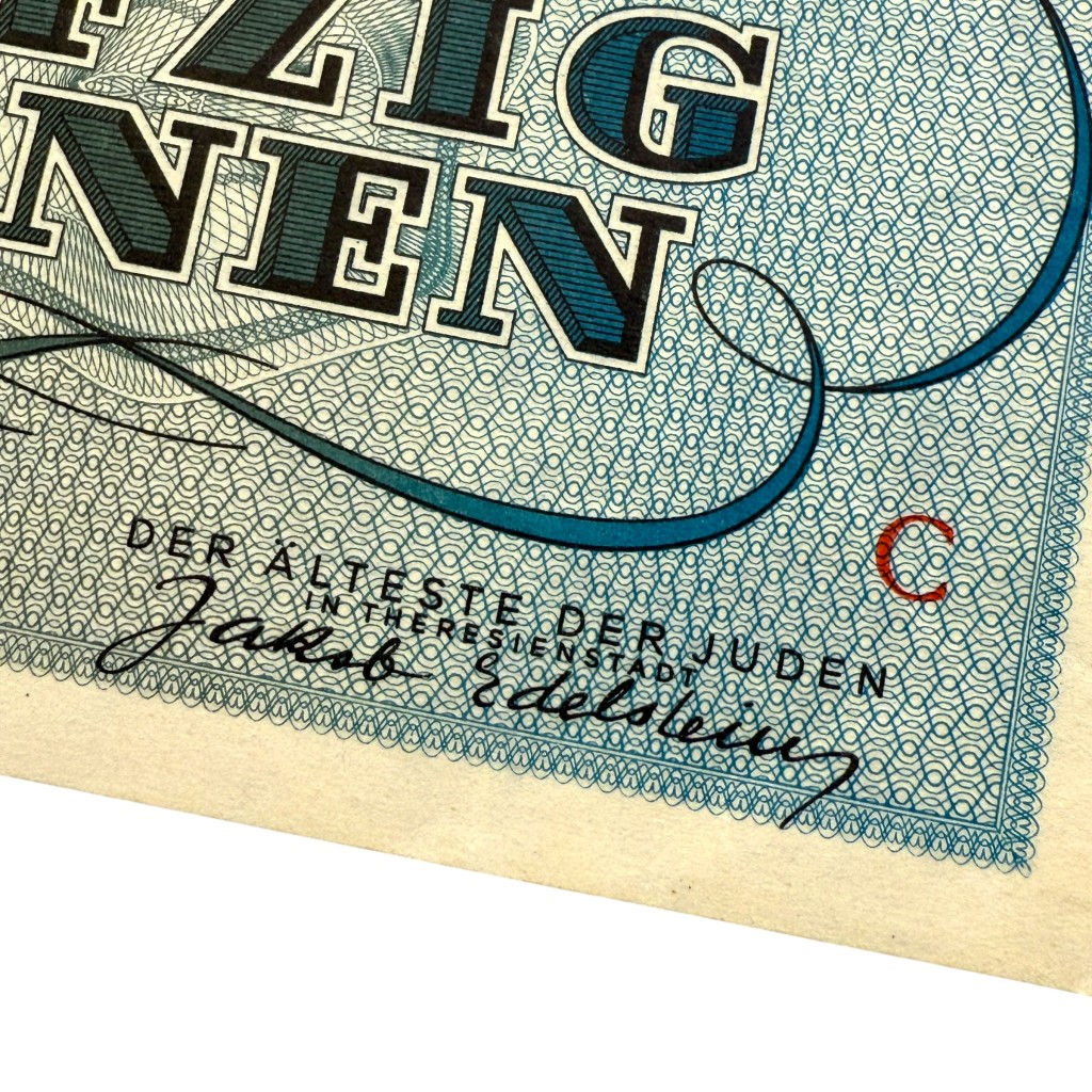 De keerzijde toont sierlijke belettering met de tekst “Quittung über Fünfzig Krone” (Ontvangstbewijs voor 50 Kronen), gedateerd 1 januari 1943 en ondertekend door de “Älteste der Juden in Theresienstadt” (Oudste der Joden in Theresienstadt).