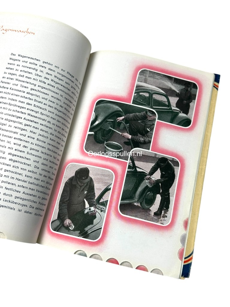 De handleiding staat vol met auto afbeeldingen en uitleg over de Volkswagen Kever en tevens zit de originele omslag nog om de handleiding.