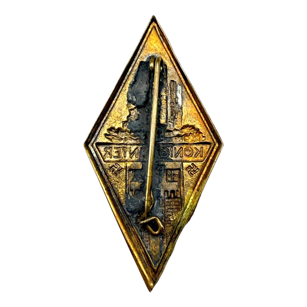 Deze Duitse speld, vermoedelijk afkomstig uit de jaren 1930, is een decoratief evenementinsigne met de plaatsnaam Königswinter. De langwerpige, ruitvormige speld toont een gedetailleerde reliëfafbeelding van lokale architectuur en een burchtruïne. Een interessant object voor verzamelaars van Duitse speldjes, regionale badges en vooroorlogse memorabilia.