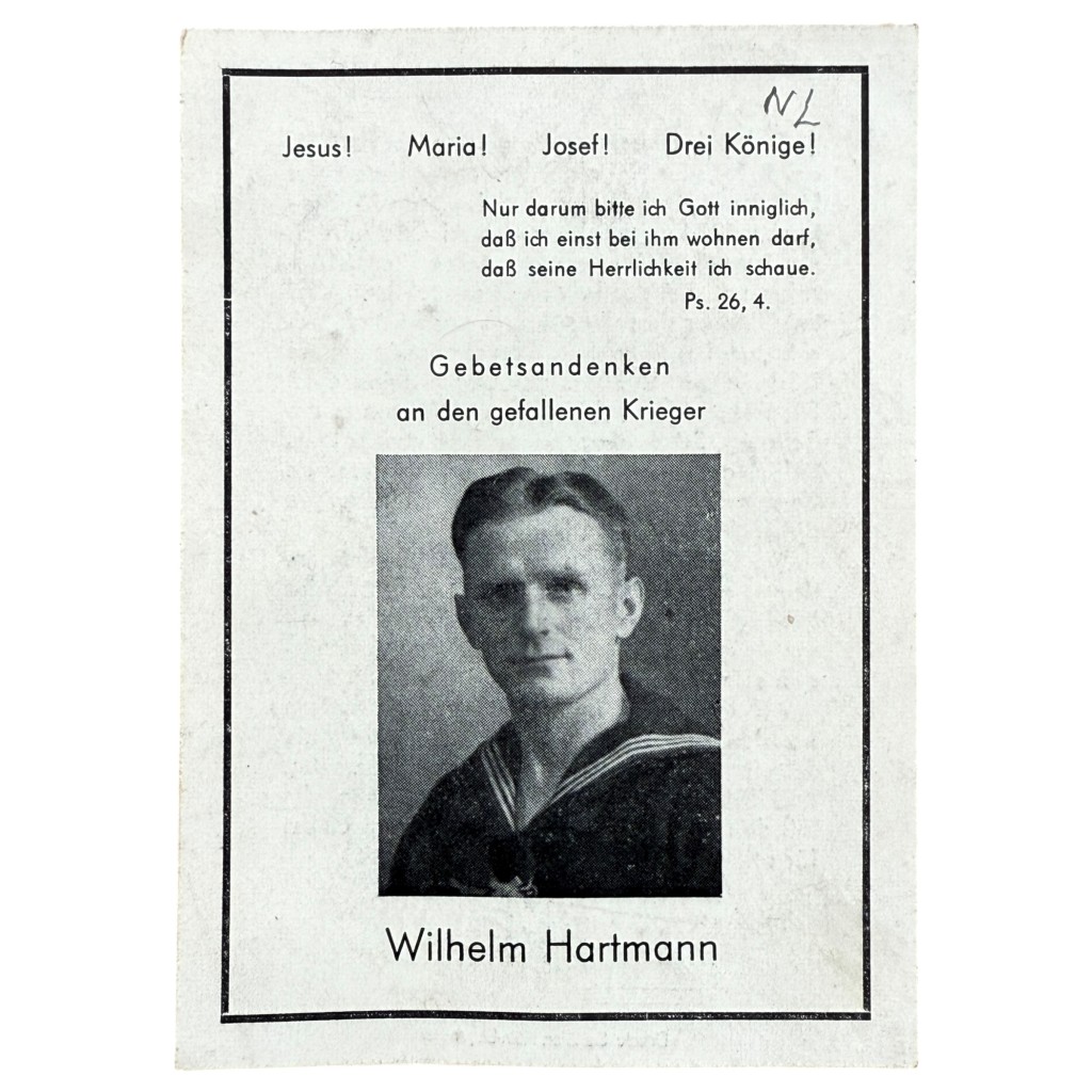 This German death card commemorates Wilhelm Hartmann, a sailor of the Kriegsmarine, who was killed on January 30, 1945, during an Allied air raid on the base near Bergen op Zoom.