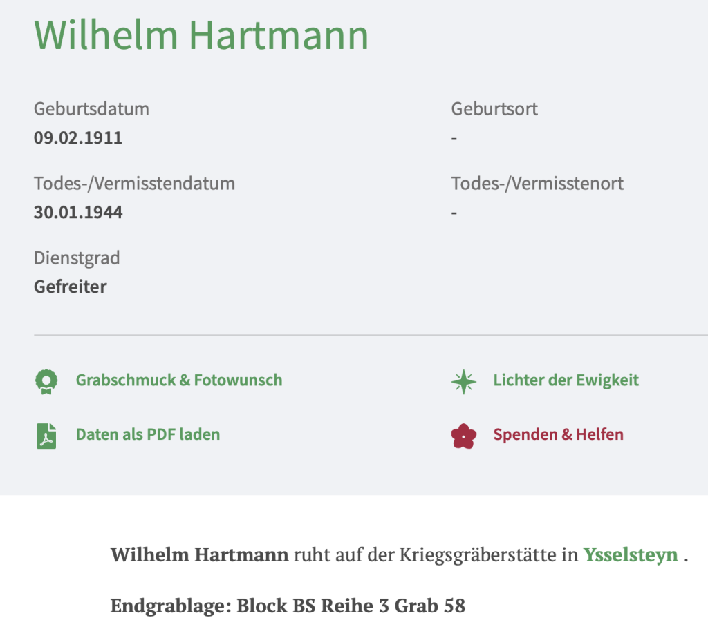He is now buried at the German War Cemetery in Ysselsteyn and can be found on the German war graves website Volksbund.de.