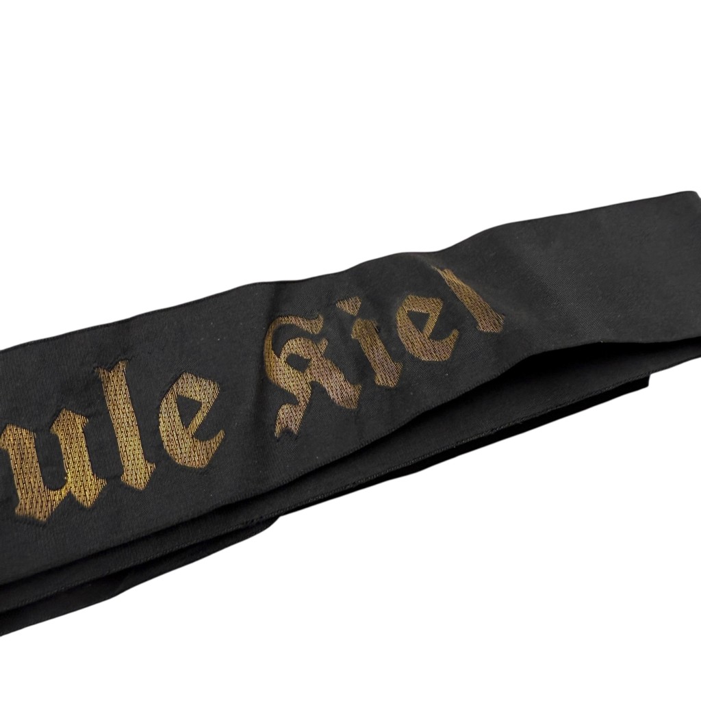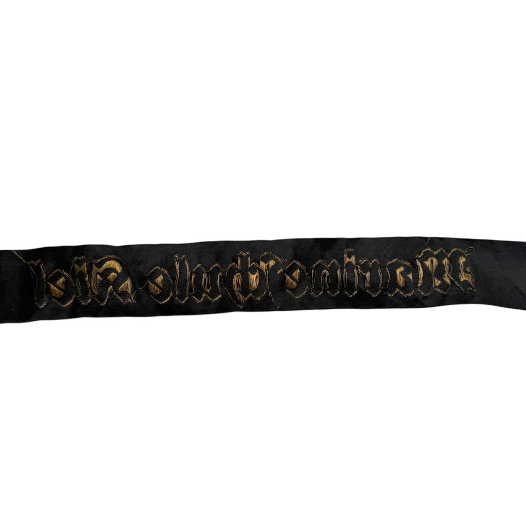 This German Kriegsmarine cap tally with the inscription “Marineschule Kiel” is made of black silk-like ribbon material and features gold-colored woven Gothic lettering.