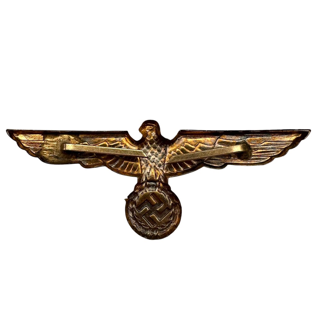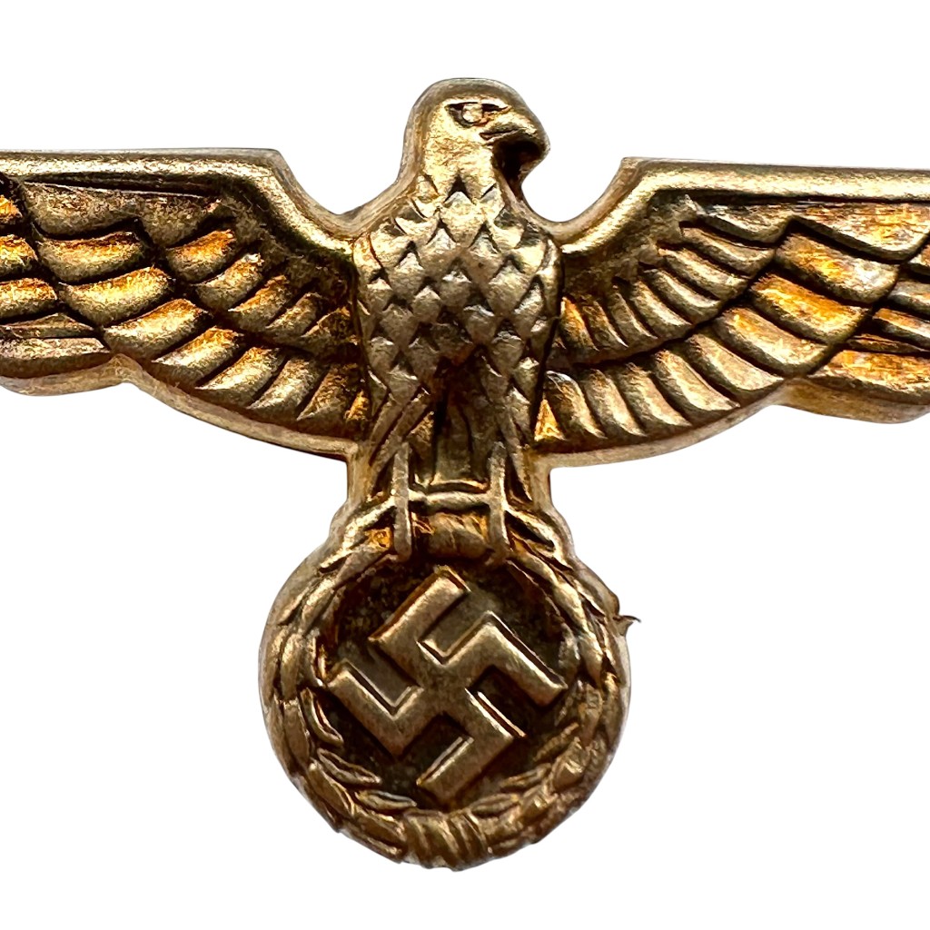 This metal visor cap eagle of the German Kriegsmarine from the Second World War is made of gold-colored metal and features the characteristic eagle with outstretched wings above a wreath.