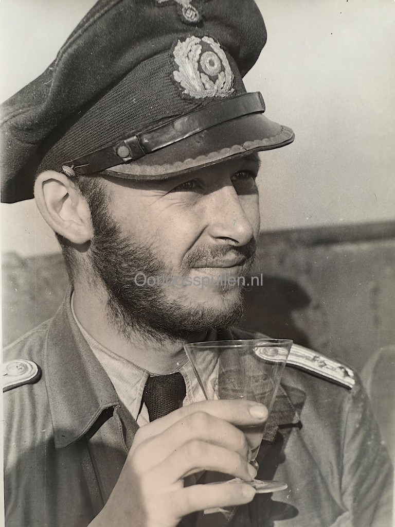 Deze Duitse portretfoto van een Duitse Kriegsmarine officier dateert uit de Tweede Wereldoorlog. De foto toont de officier in uniform met pet, terwijl hij een glas in de hand houdt.