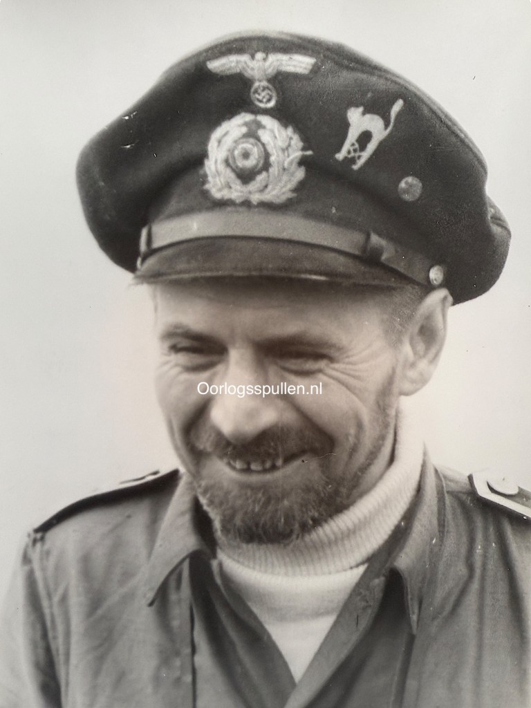 Deze Duitse Kriegsmarine U-boot portretfoto toon een lachende bemanningslid met het bekende ‘zwarte kat’-embleem op zijn pet.
