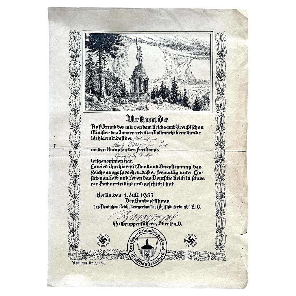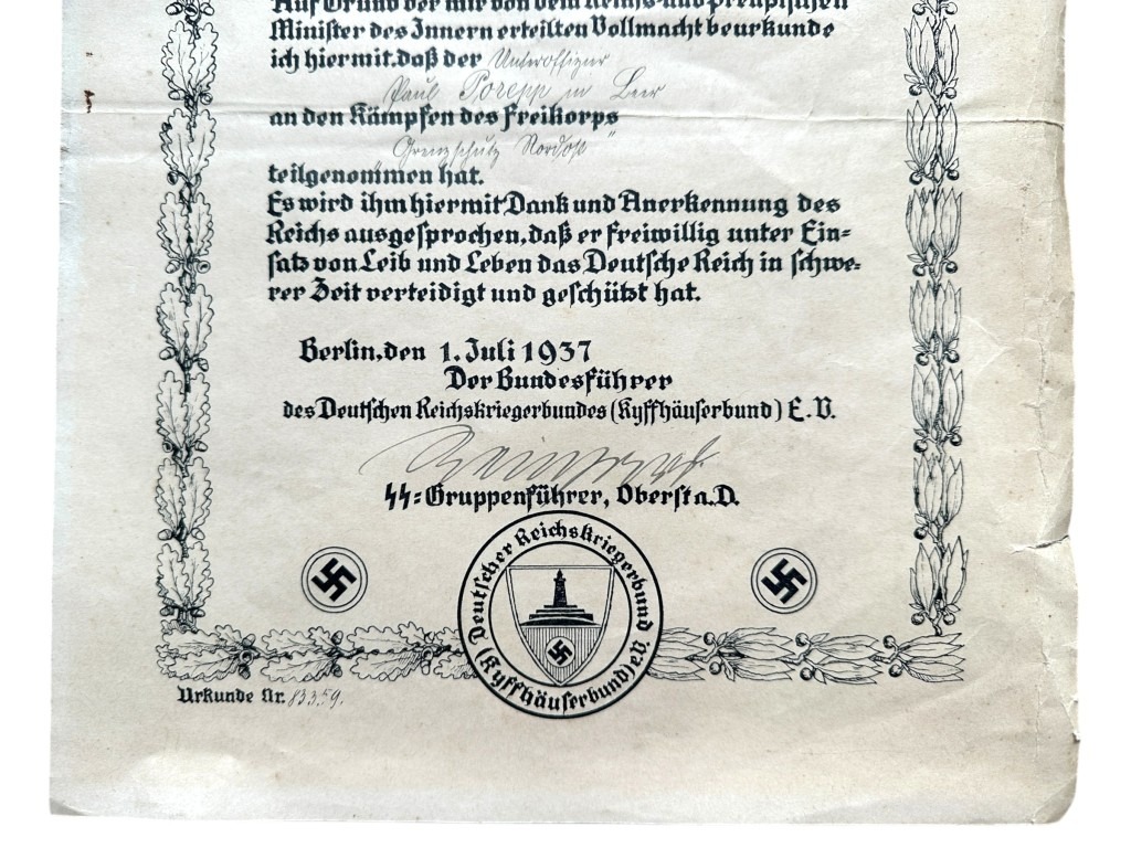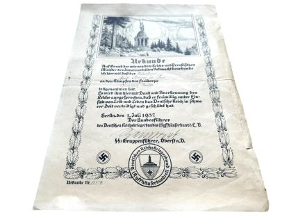 This German Kyffhäuserbund (Deutscher Reichskriegerbund) certificate is in used condition, dates from July 1, 1937 and was signed by an SS-Gruppenführer.