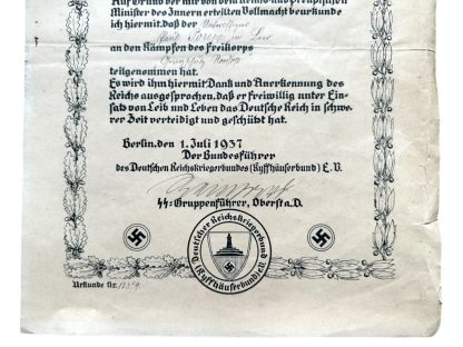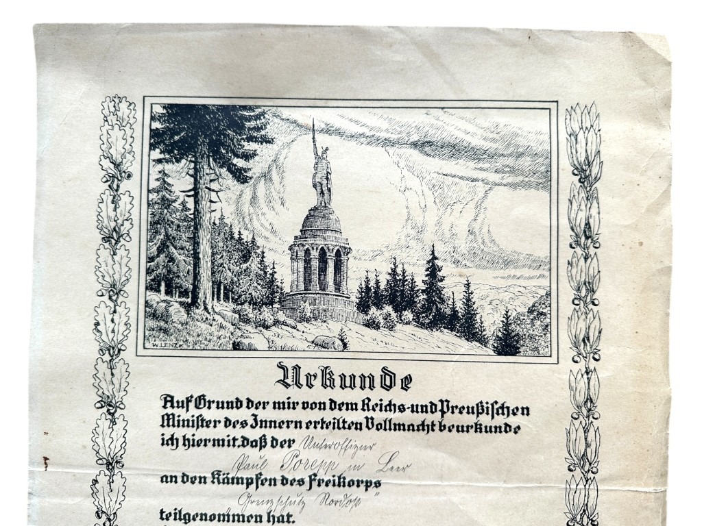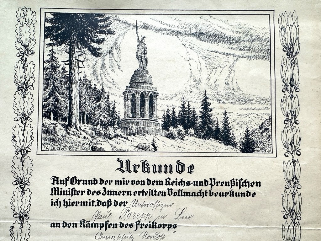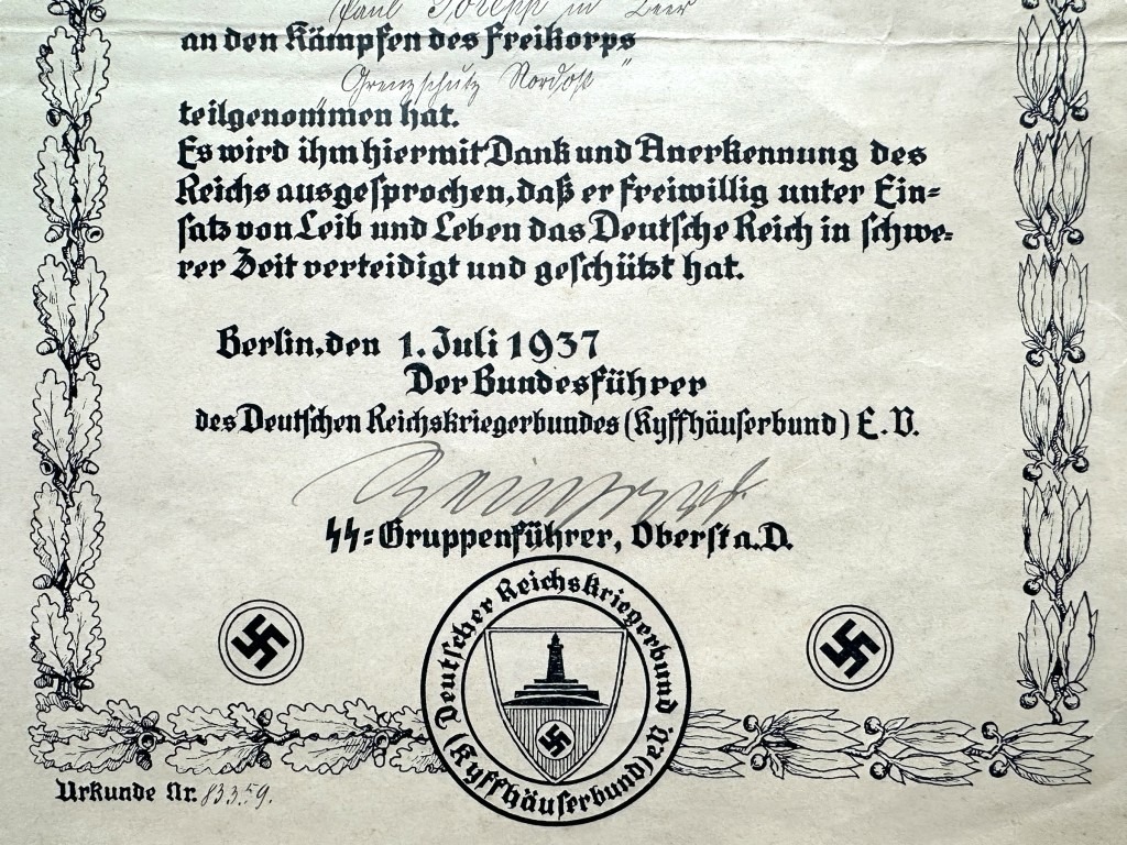 De oorkonde werd uitgereikt aan een lid dan bij het Freikorps gevochten.