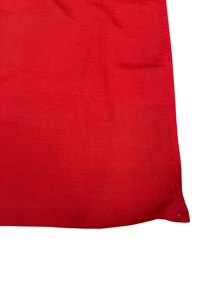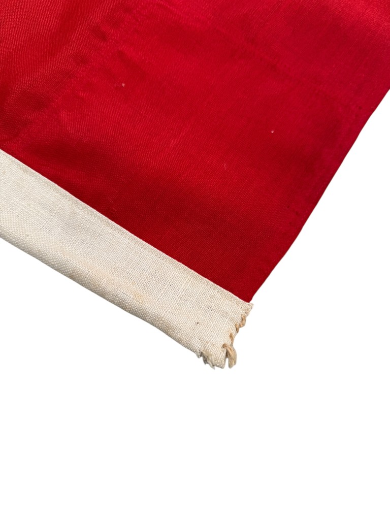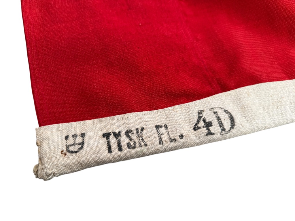 Deze grote Duitse Reichskriegsflagge uit de Tweede Wereldoorlog, met imposante afmetingen van 335 x 200 cm, werd geproduceerd in Denemarken tijdens de Duitse bezetting. Het ontwerp volgt het officiële patroon dat in die periode door de Duitse strijdkrachten werd gebruikt. De vlag is dubbelzijdig bedrukt, waardoor het motief aan beide zijden volledig zichtbaar is, zoals gebruikelijk bij grootformaat militaire en maritieme vlaggen. Het doek is vervaardigd uit stevig geweven textiel en voorzien van een versterkte witte zoom met traditioneel aangebracht bevestigingstouw. De markering “TYSK FL. 4D” langs de zoom duidt op Deense productie voor militair gebruik in de oorlogsjaren.