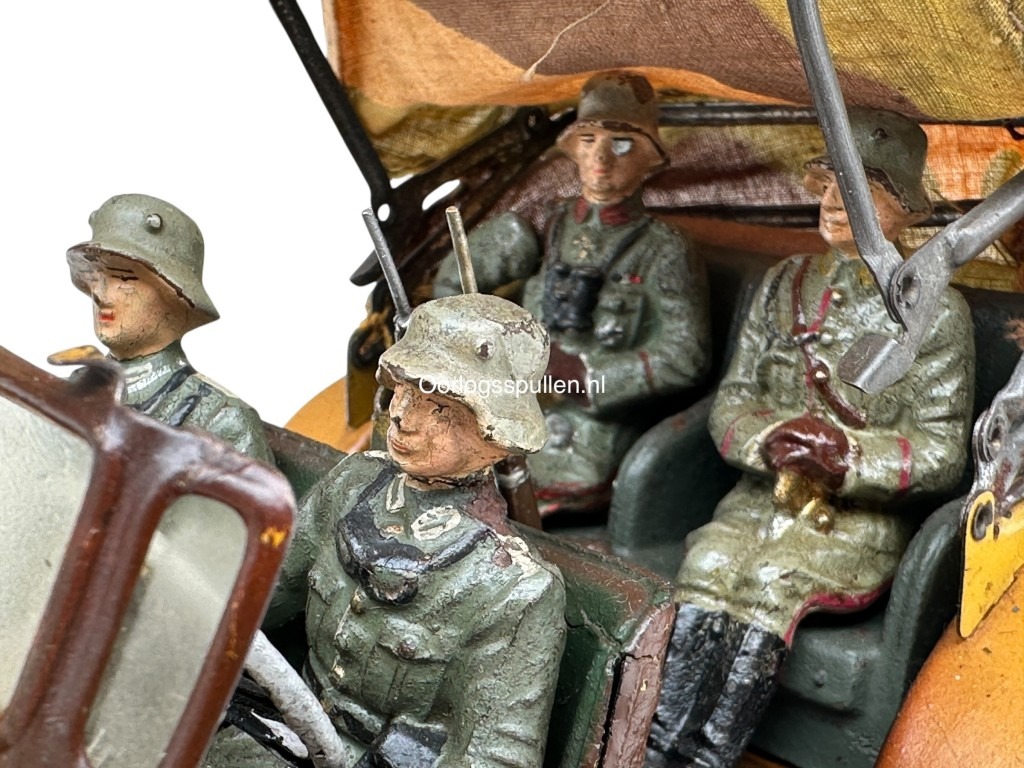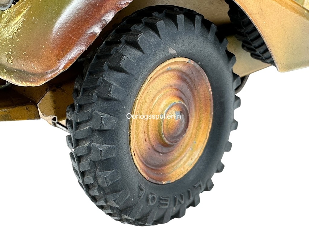 Deze zeldzame Duitse militaire speelgoedauto van het merk Lineol, geproduceerd in Duitsland rond de jaren 1939–1945.