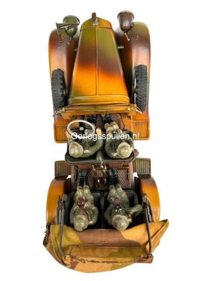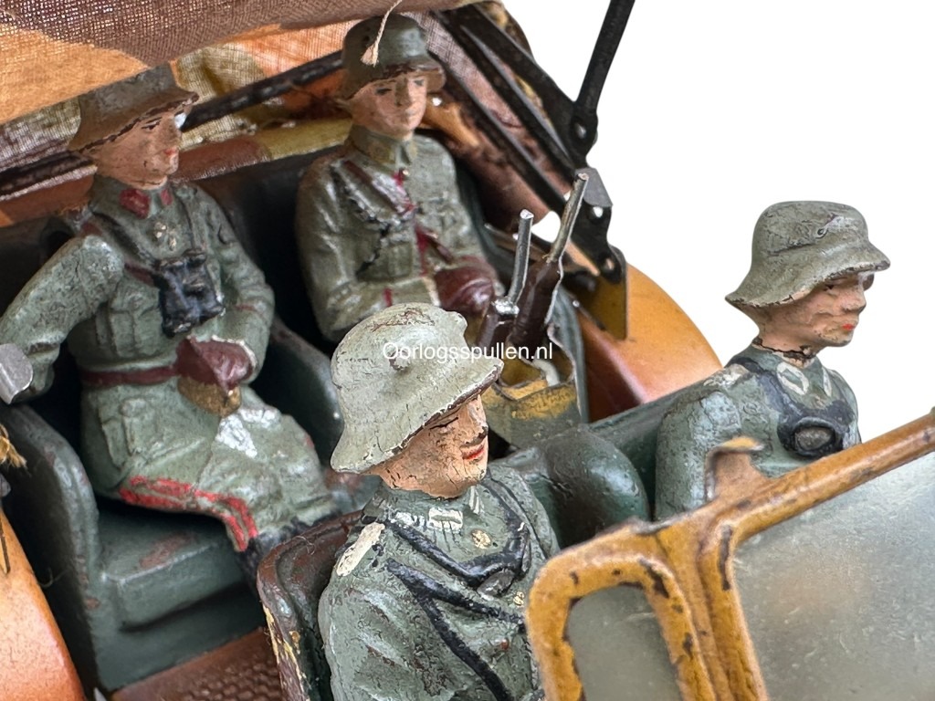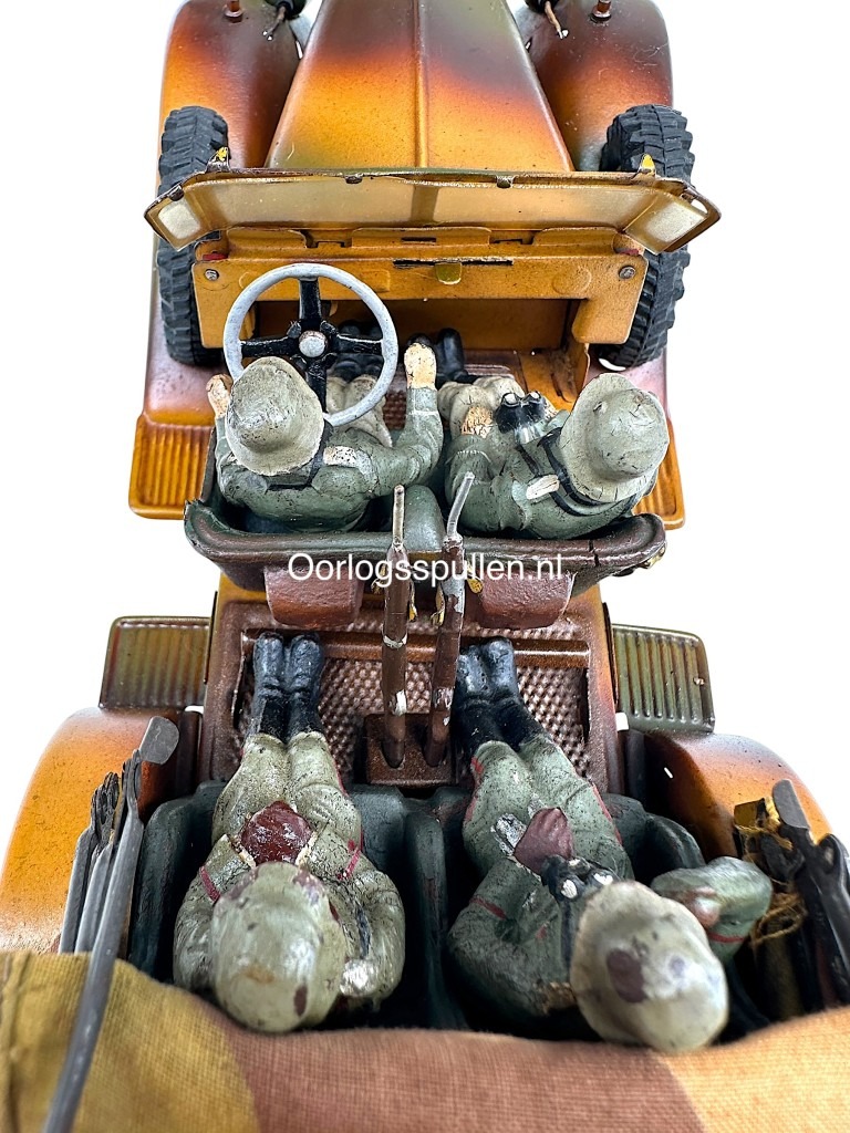 Compleet met camouflagekleuren, stoffen vouwdak en vier gedetailleerde soldaten in uniform.