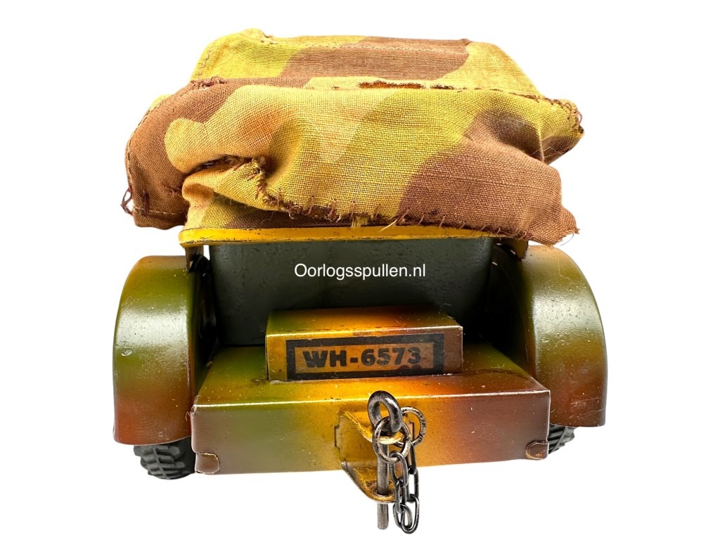 De auto is voorzien van Wehrmacht-markeringen zoals de adelaar en nummerplaat WH-6573.