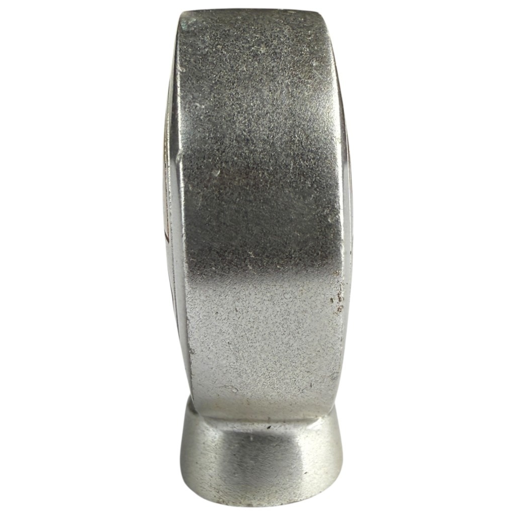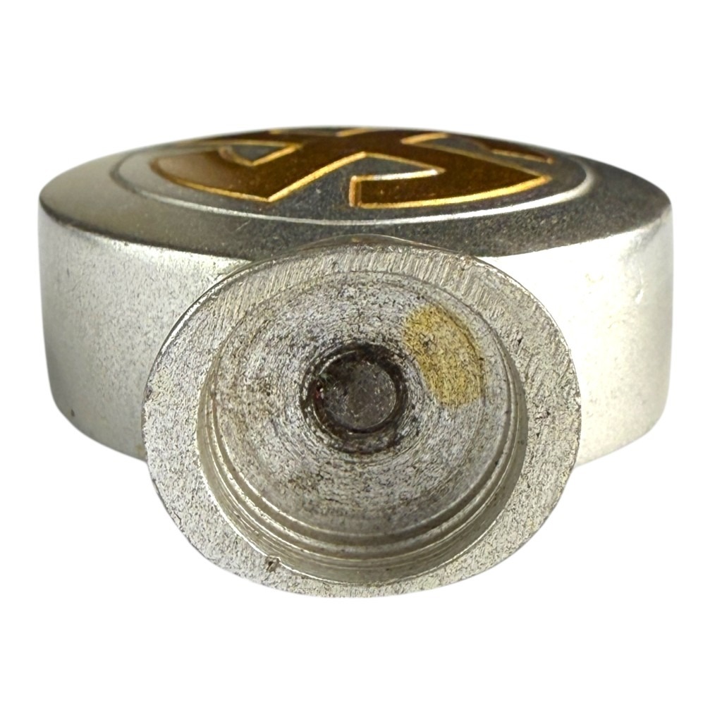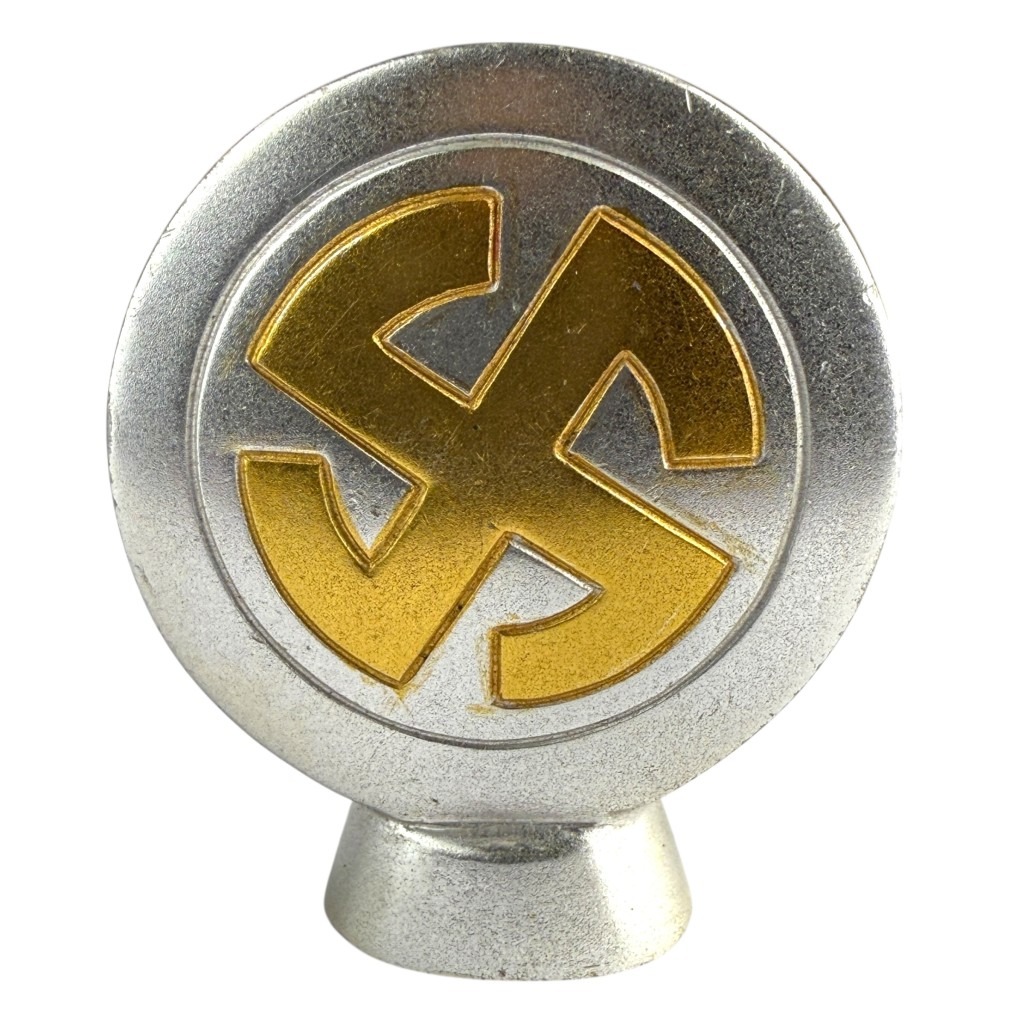 Het stuk is vervaardigd uit metaal met een fraaie verzilverde afwerking en voorzien van het karakteristieke vergulde swastika-embleem aan beide zijden.