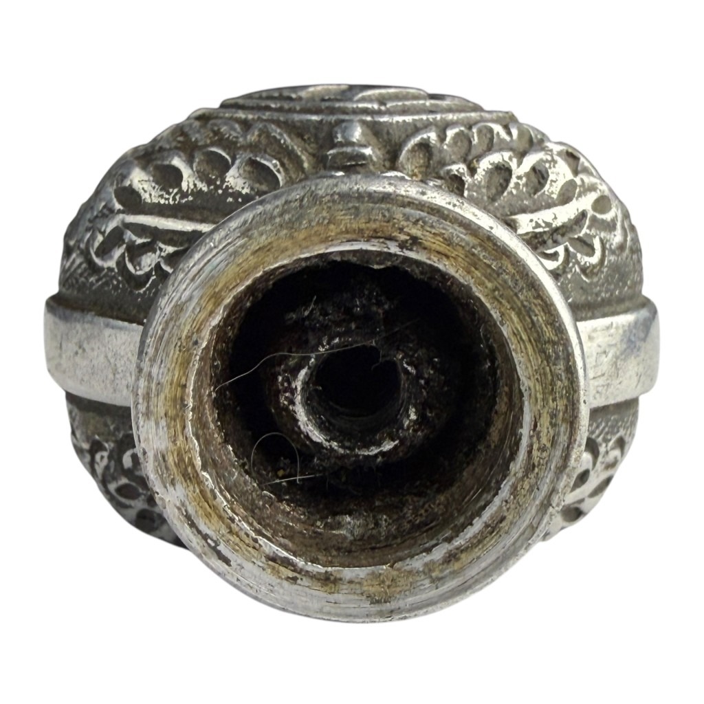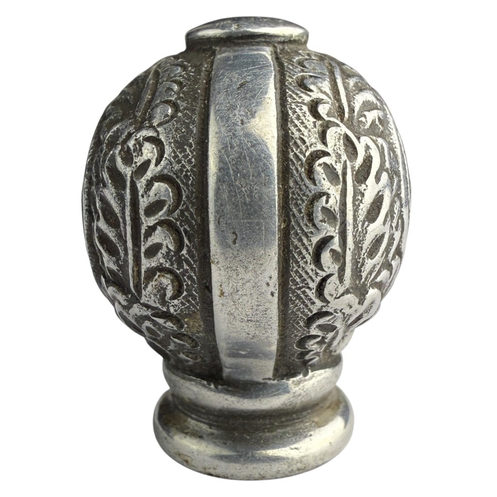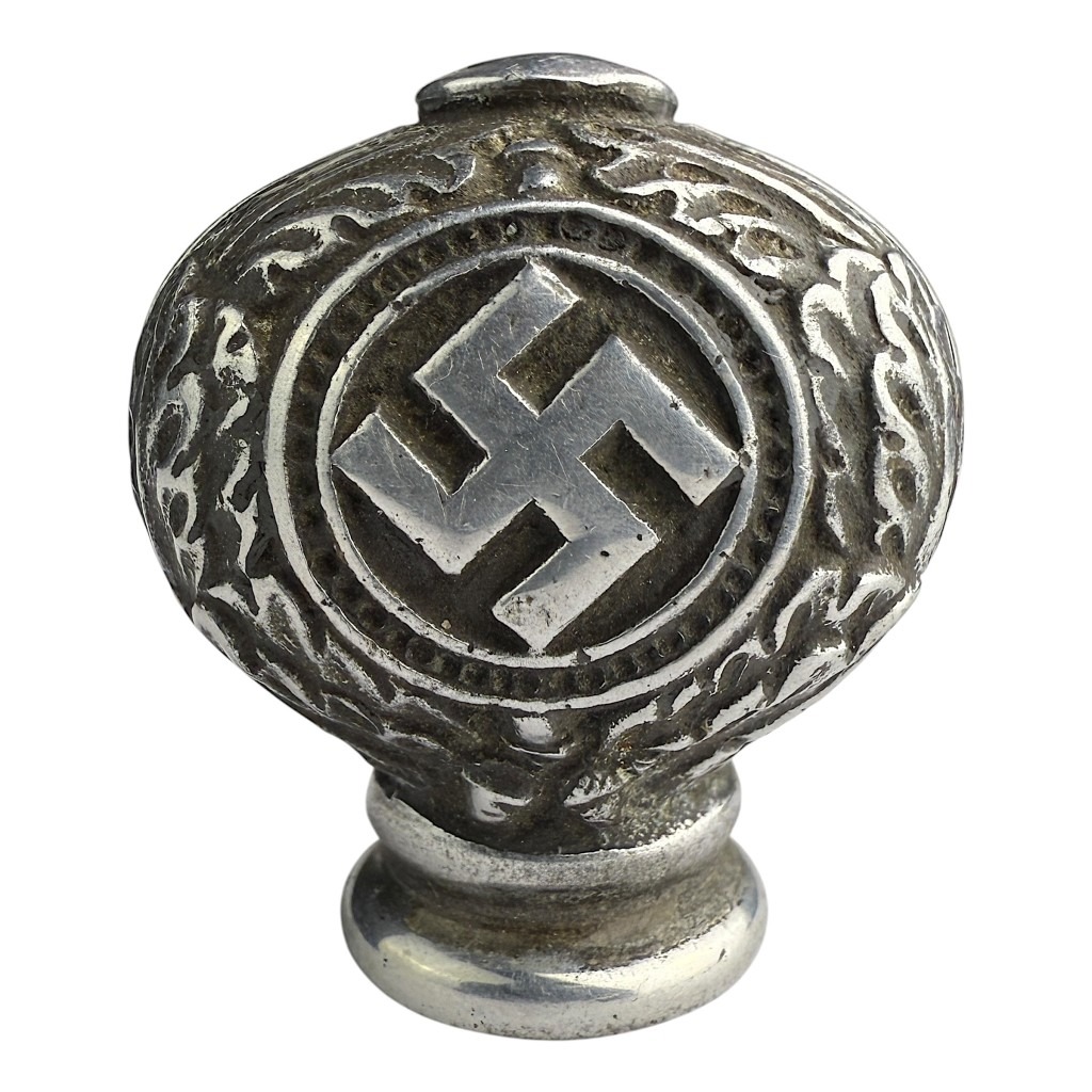 Aan weerszijden bevindt zich het kenmerkende swastika-embleem in reliëf, omringd door sierlijke patronen. De schroefdraad aan de onderzijde is intact, waardoor dit onderdeel uitstekend geschikt is als originele vervanging of aanvulling voor een bestaande dolk.