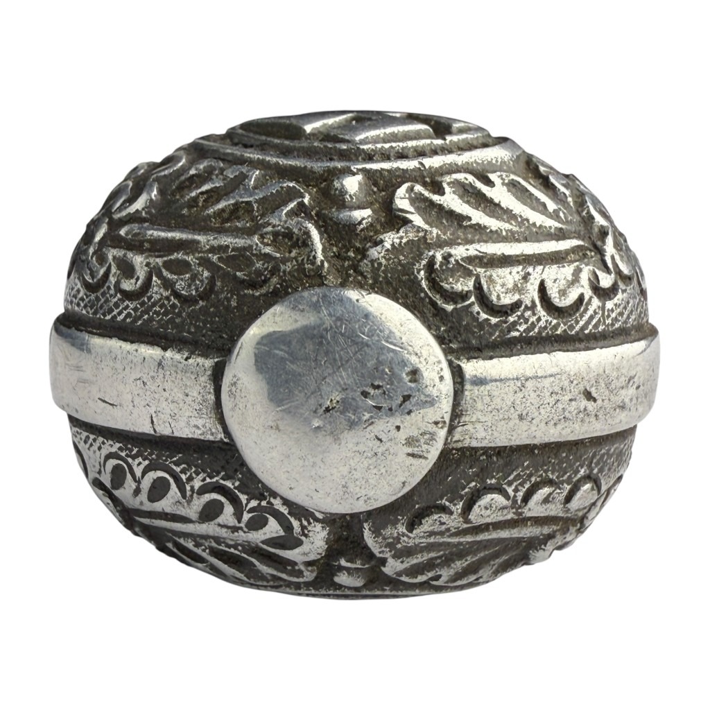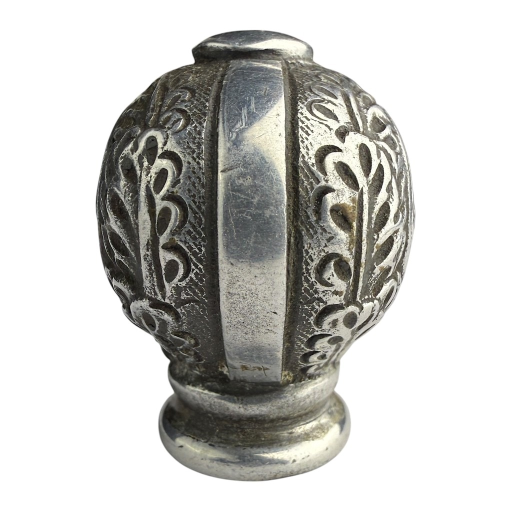 Het stuk is vervaardigd uit metaal met een fraaie verzilverde afwerking en voorzien van een gedetailleerd eikenloofmotief.