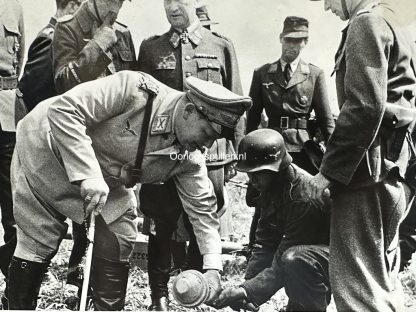 Deze Duitse Luftwaffe foto is in goede conditie en daarop is Reichsmarschall Hermann Göring op te zien met fronttroepen van de Luftwaffe.