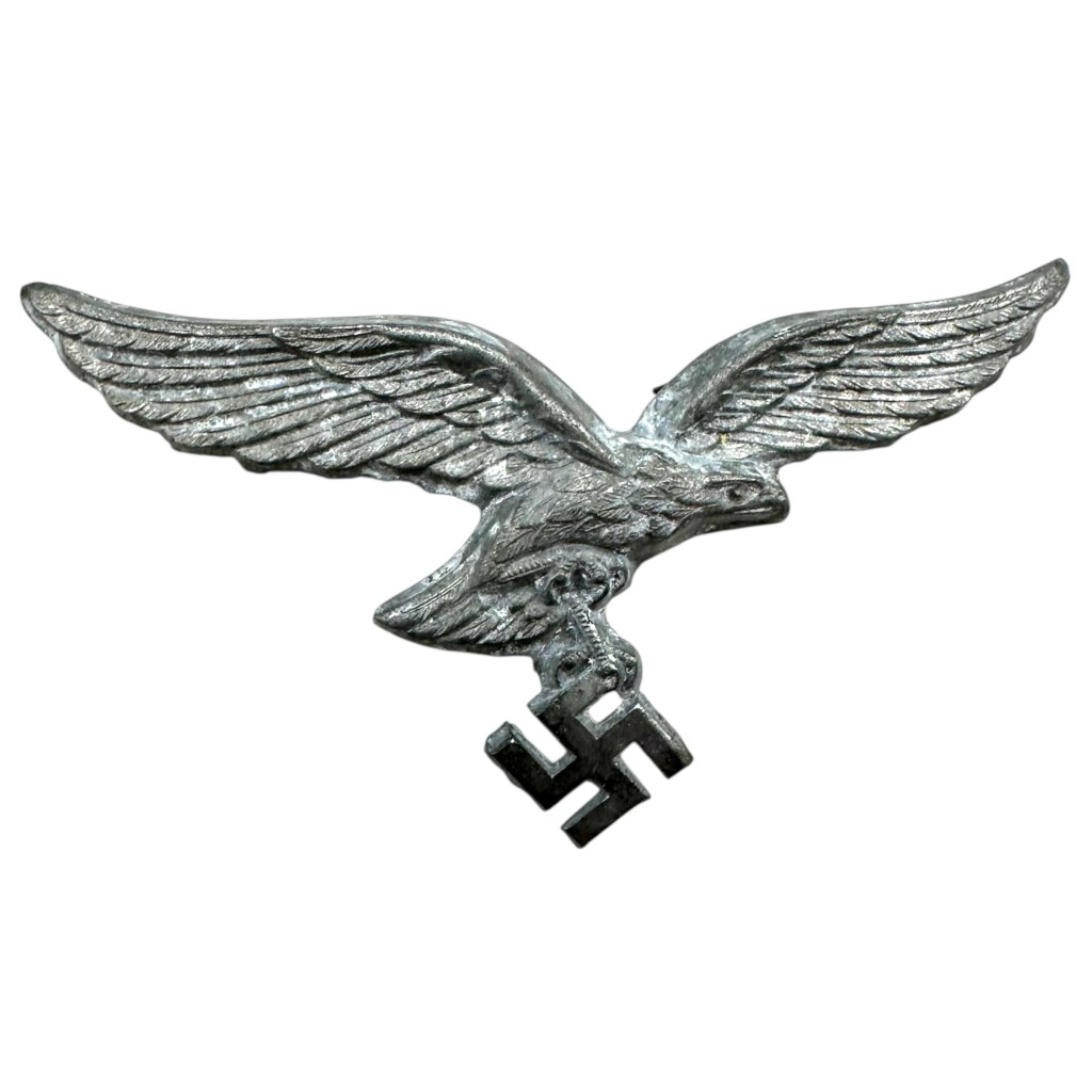 Deze metalen petadelaar van de Duitse Luftwaffe uit de Tweede Wereldoorlog is uitgevoerd in zilverkleurig metaal en toont de karakteristieke vliegende adelaar met het swastika daaronder. Aan de achterzijde zijn de originele bevestigingspinnen nog aanwezig. Dit type embleem werd gedragen op vizierpetten van Luftwaffe-personeel. Een interessant stuk voor de Luftwaffe-verzameling.