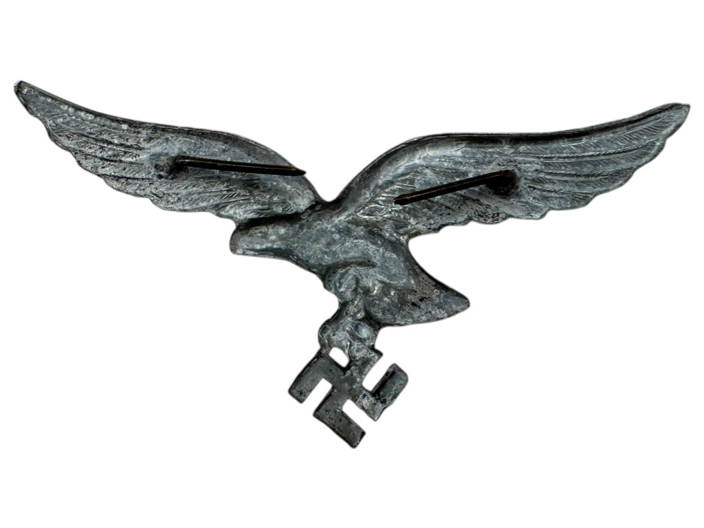 This metal Luftwaffe cap eagle from the Second World War is made of silver-coloured metal and features the characteristic flying eagle with the swastika beneath it. The original attachment pins are still present on the reverse. This type of insignia was worn on the visor caps of Luftwaffe personnel.