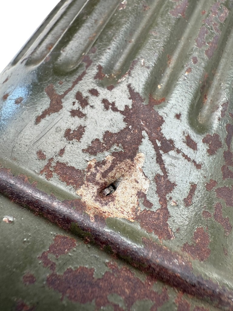 The canister shows signs of use and field wear, including a small shrapnel hole.