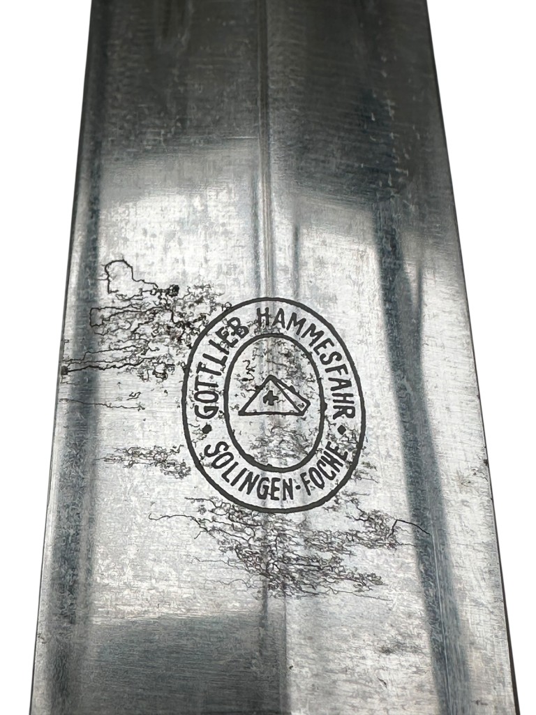 The blade features the etched motto “Meine Ehre heißt Treue,” which remains clearly visible and well defined. On the reverse side, the maker’s mark of Gottlieb Hammesfahr, Solingen-Foche is present.