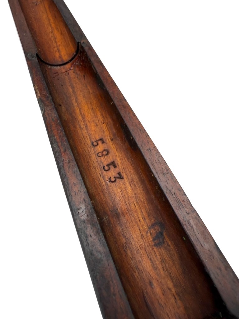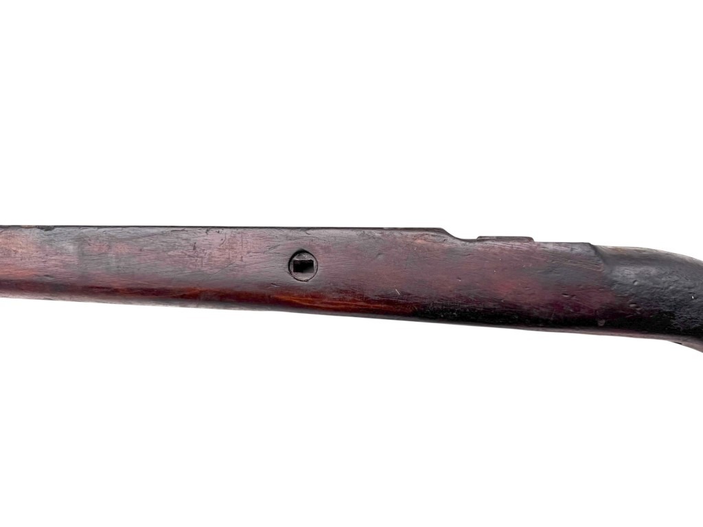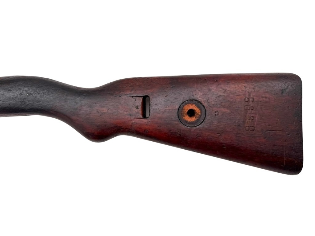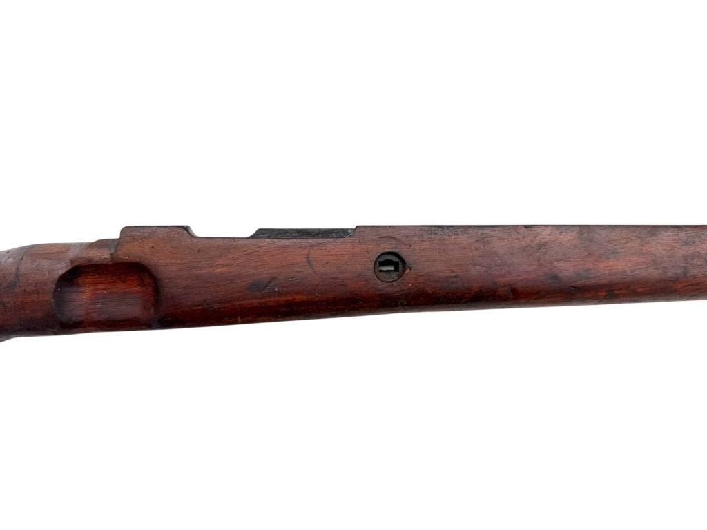 Regelmatig werden de Mauser K98 houten kolven ingekort na de oorlog, dit is niet het geval bij deze en deze heeft nog de originele lengte!