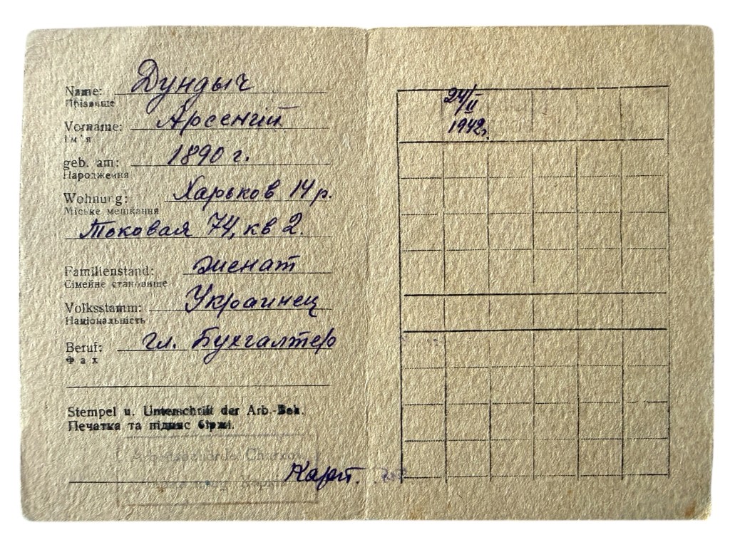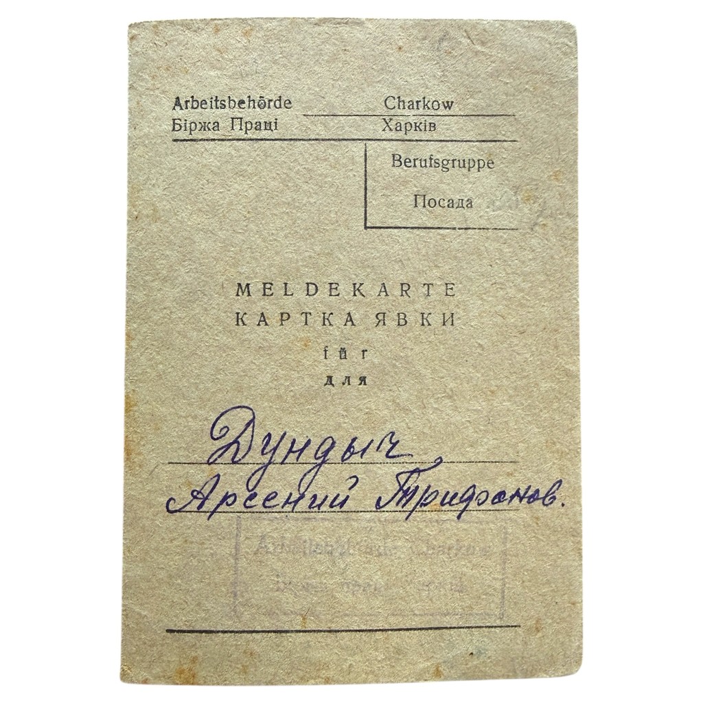 Deze originele Meldekarte (meldingskaart) van de Arbeitsbehörde Charkow (Arbeidsbureau Charkow / Kharkiv) betreft een Duits bezettingsdocument uit de Tweede Wereldoorlog, afgegeven op naam van Dundik Arsenij (geboren 1890).